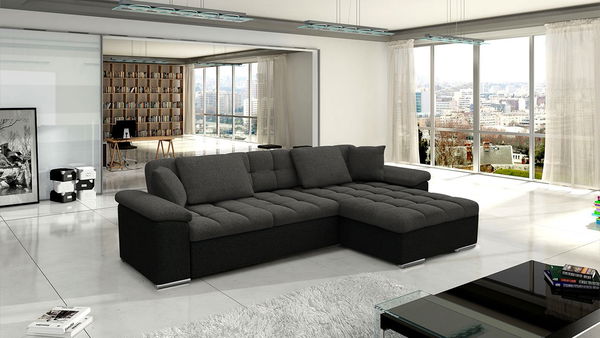 Moderní styl, ve kterém byla vyrobena rozkládací rohová pohovka Dante, se vyznačuje prošívaným sedákem, opěradlem a klasickými barvami. Prvky z ekokůže jí dodávají elegantní vzhled. Moderní rohová pohovka do obývacího pokoje má funkci spaní a nádobu na ložní prádlo. Zadní část rohové pohovky je čalouněna látkou, což z ní činí samostatně stojící kus nábytku. Kromě toho si můžete vybrat stranu rohové pohovky (levou nebo pravou). Rozkládací pohovka do obývacího pokoje má tvar písmene L. Díky vysoce elastické pěně a vlnovým pružinám použitým v sedadle je jeho používání velmi pohodlné. Na to mají vliv i polštáře, které jsou součástí rohové pohovky Dante.