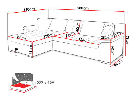 ZobrazitRohová sedací souprava je ideální volbou pro ty, kteří hledají pohodlí a styl. Rohová sedačka Dino uspokojí i ty nejnáročnější uživatele. Vysoce elastická pěna a pružiny použité v procesu výroby nábytku zajišťují zvýšený komfort při každodenním používání. Kvalitní čalouněné látky mu dodávají jedinečný vzhled a dlouhodobou životnost. Zajímavý kus nábytku potvrzuje, že je jednoduše vytvořen pro moderní obývací pokoje. Kromě toho sedačka dokonale zapadá do malého i většího obývacího pokoje. Nábytek má funkci na spaní – když se rozloží, získá velkou plochu, což z ní činí ideální místo pro každodenní spaní. Rozměry: délka: 280 cm, šířka: 160 cm, výška: 76 cm, plocha na spaní: 227 x 129 cm Rozměry úložného prostoru: délka: 147 cm šířka: 85 cm výška: 23 cm Orientace: levá nebo pravá Materiál: dřevěný rám + dřevotříska, vysoko funkci spaní, má úložný prostor, polštáře v ceně, polštáře na zip, volně stojící roh (čalouněné látkou) Záruka: 24 měsíců