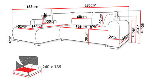 ZobrazitRohová sedačka je ideální volbou pro ty, kdo hledají pohodlí a styl. Představte si, že se ponoříte do relaxačního objetí naší rohové rozkládací pohovky Duolos. V pozadí můžete slyšet uklidňující zvuky vaší oblíbené hudby, zatímco si na rozkládacím modelu natáhnete unavené nohy. Zní to hezky, že? Kromě každodenního pohodlí nabízí tato varianta také další funkce. Rohová sedačka Duolos je zároveň praktickým základem pro spaní, úložným prostorem na ložní prádlo a opěradlem v podobě pohyblivých polštářů. Je to volně stojící typ, což znamená, že jej můžete umístit kdekoli v obýváku. Rozměry: šířka: 285 cm hloubka: 188 cm výška: 80 cm Spací plocha: 240 x 135 cm úložný prostor: 136 x 58 x 19 cm Rohová strana: univerzální (stranu si volí zákazník při montáži) Provedení: rám: tvrdé dřevo + měkké dřevo + měkké dřevo + měkké dřevo 8 cm silná pěna T2844 + 80 g/m³ výplň + plst + vlnová pružina "typ A" rohová sedačka je rozkládací má funkci spánku úložný prostor nohy: černý kov + černý plast opěradlo ve formě pohyblivých polštářů polštáře se zapínají na zip polštáře v ceně volně látkou) Záruka: 24 měsíců