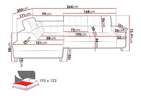 ZobrazitRohová sedačka je ideální volbou pro ty, kdo hledají pohodlí a styl. Styl a elegance moderní rohové sedačky Elsie se perfektně hodí do interiéru elegantního obývacího pokoje, ale i obytného prostoru, kde si každý den hrají děti. Matné nohy dělají rohovou sedačku stejně působivou jak v podkroví, tak iv industriálním obývacím pokoji. Široká nabídka potahových látek zahrnuje i praktické návrhy materiálů odolných vůči skvrnám a ohnivzdornosti, jakož i těch, které se vyznačují zvýšenou odolností proti poškrábání a tahání nití zvířecími drápy. Jedná se zejména o praktická řešení v bytech vhodných pro domácí zvířata. Zvýšený komfort při odpoledním odpočinku na rohové sedačce poskytuje měkký sedák podepřený pevnou konstrukcí i polohovatelné opěrky hlavy. Jejich umístění můžete plně přizpůsobit tvaru těla a zvýšit tak své pohodlí. Z hlediska funkčnosti se rohová sedačka s funkcí na spaní snadno rozloží ak přípravě místa na spaní pro sebe nebo hosty stačí vysunout delší část sedáku. A co víc, uvnitř sedačky je úložný prostor na ložní prádlo. Tato šikovně skrytá přihrádka může sloužit na polštáře a peřiny, jakož i místo na odkládání sezónního oblečení a jiných zřídka používaných doplňků. Rohová sedačka typu L je volně stojící, to znamená, že její záda jsou potažena látkou. Toto řešení umožňuje libovolně umístit sedačku v prostoru – i když je umístěna ve středu obývacího pokoje, bude vypadat skvěle. Rozměry: délka: 264 cm šířka: 203 cm výška: 73-91 cm Plocha na spaní: 193 x 123 cm Rozměry úložného prostoru: délka: 174 cm šířka: 92 cm výška: 18 cm Rohová strana: levá nebo pravá Provedení: konstrukce sedadla + d T 2844, tloušťka 11 cm + oválné konstrukce opěradla: dřevěný rám + dřevovláknitá deska + vysokoelastická pěna T 2844, tloušťka 7 cm + ovál rohová sedačka je rozkládací má funkci spánku roh typu L úložný prostor nastavitelné opěrky hlavy trvale připevn kovové nohy (antracit) volně stojící rohová sedačka (záda potažená látkou) Záruka: 24 měsíců