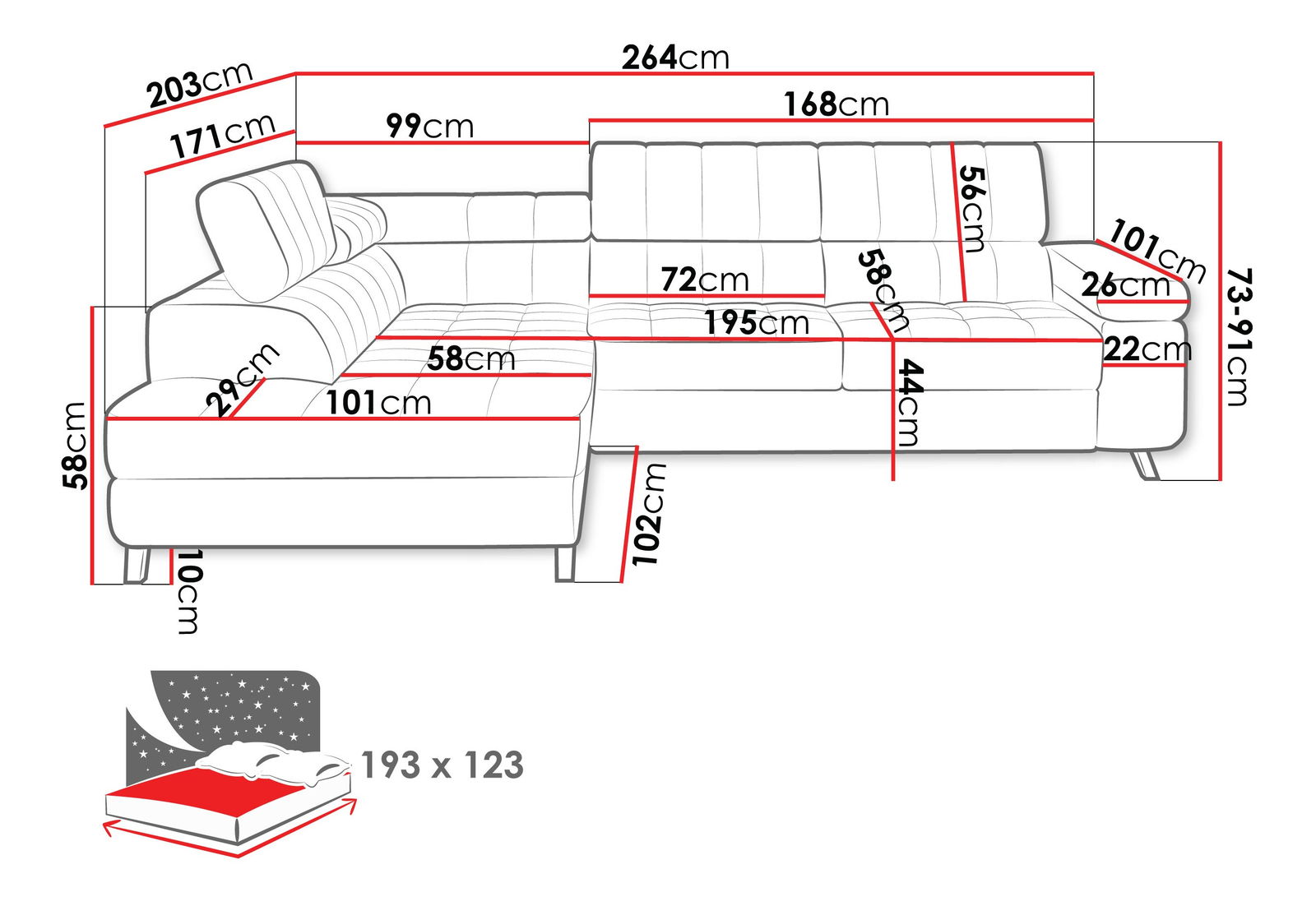 ZobrazitRohová pohovka je ideální volbou pro ty, kteří hledají pohodlí a styl. Rohová sedačka Elsie Premium s funkcí spánku je šik a elegantní s mnoha praktickými funkcemi. i vlastnostmi, které z něj udělají vaše oblíbené místo v celém domě Rohová sedačka s funkcí na spaní typu L je vybavena polohovatelnými opěrkami hlavy a úložným prostorem na lůžkoviny. přednostmi rohové sedačky jsou i potahové látky.Příjemné na dotek a maximálně funkční. Provedení: konstrukce sedáku: dřevěný rám + vlnitá pružina + plst + 11 cm silná pěna T-2844 + vlnovec, konstrukce opěradla: dřevěný rám + dřevovláknitá deska + 7 cm silná pěna T-2844 + vlnovec, rohová pohovka je rozkládací, má funkci nastavitelné opěrky hlavy, čalouněné opěradlo napevno, zadní nohy z plastu (černé) - přední nohy z kovu (antracit), volně stojící rohová jednotka (zadní část čalouněná látkou) Záruka: 24 měsíců