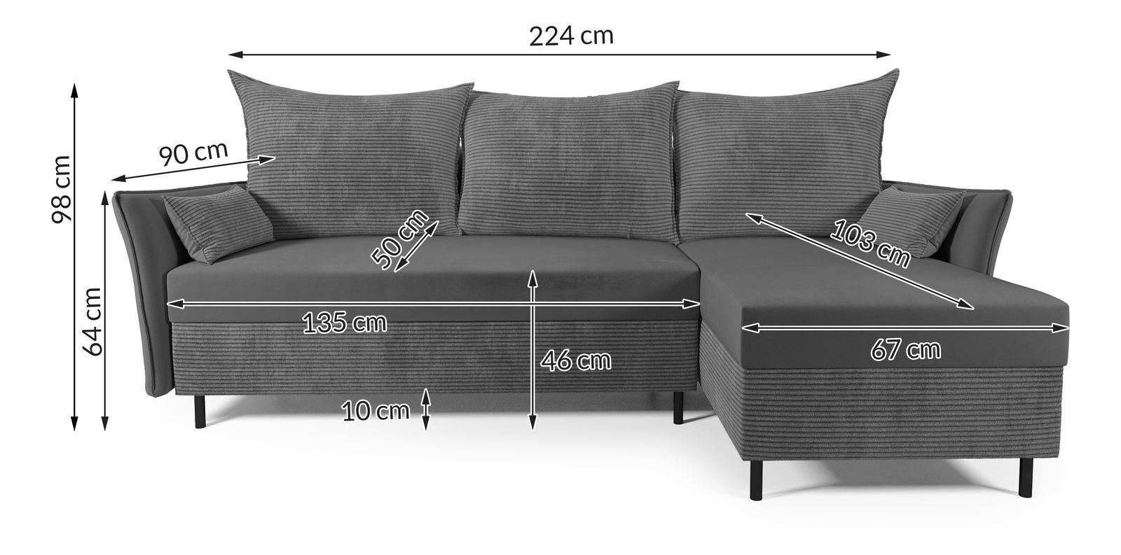ZobrazitPřipusťte do svého obývacího prostoru eleganci s dotekem modernosti s naší rohovou sedačkou Goofy. Vykouzlená z pevného dřeva a nábytkové desky, tato sedačka nabízí komfort díky výplni z bonellových pružin a 4 cm pěny T 30. S jejími černými kovovými nožičkami (10 cm), štíhlými opěrkami na ruce (56x5x90 cm), a prostorným úložným prostorem v bílé přidáváte ke svému interiéru nejen styl, ale také funkčnost.
