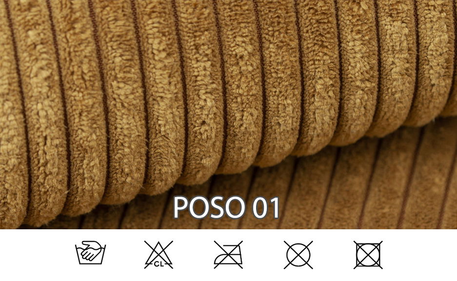 Látku Poso řadíme mezi velurovou tkaninu. Jedná se o tkaninu podobnou plyši s krátkým vlasem, která se vyznačuje sametově jemným povrchem. Svým typickým vzhledem připomíná manšestr. Vyznačuje se dostatečnou pevností a odolností. Využívá se v nábytkářství jako potahová látka na čalouněný nábytek. K údržbě a čištění používejte navlhčený hadřík a speciální prostředky pro čalouněný nábytek či mýdlovou vodu. Gramáž: 380 g/m². Složení: 100% polyester.