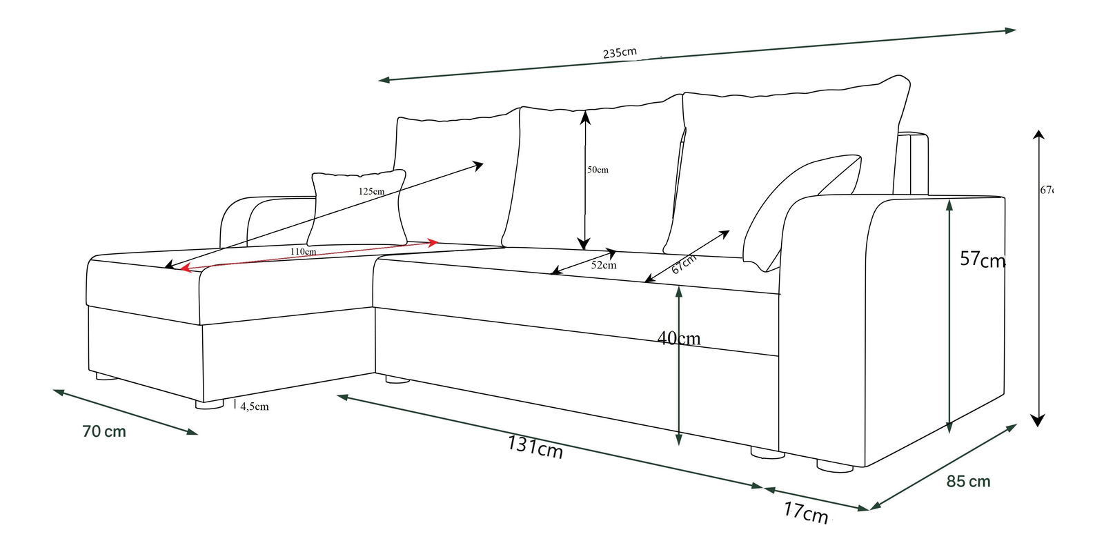 ZobrazitRohová sedací souprava Harmony L Bis v tmavě zelené barvě je ideálním doplňkem pro váš obývací prostor. Souprava nabízí dostatek místa pro celou rodinu, díky jejímu rohovému tvaru a široké sedací ploše. S výškou od 67 do 90 cm, šířkou 235 cm a hloubkou 140 cm sada Itaka10 poskytuje pohodlné a zdravé sezení. Tato sedací souprava je vyrobena z kvalitních materiálů, které zaručují dlouhou životnost a odolnost vůči opotřebení. Čistý a elegantní design soupravy se hodí do jakékoli moderního interiéru. Tato rohová sedací souprava je dokonalým řešením pro ty, kteří se nespokojí s ničím méně než s prvotřídním a funkčním nábytkem.