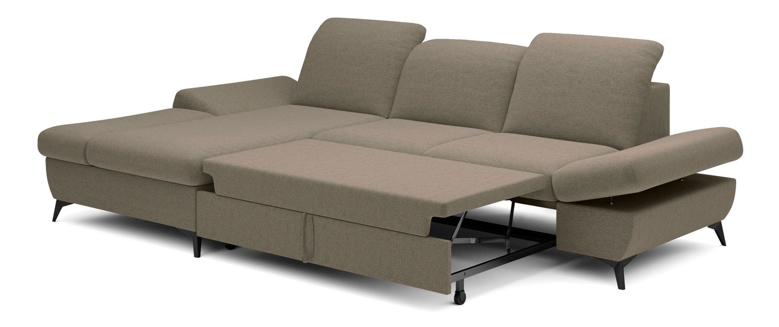 ZobrazitRohová sedačka je vyrobena z kvalitní konstrukce ze dřeva a dřevotřísky, což zaručuje pevnost a trvanlivost. Sedák je z PUR pěny a pružin, které poskytují maximální pohodlí při sezení. Sedačka je rozkládací a nabízí plochu na spaní o rozměrech 128 x 245 cm, ideální pro hosty nebo pro příležitostné přespání. Výška sezení je 42 cm, hloubka sezení 60 cm a výška područky lze nastavit od 42 cm do 57 cm, což umožňuje individuální nastavení podle potřeb uživatele. Sedačka disponuje úložným prostorem, kde můžete uschovat ložní prádlo nebo jiné věci. Hřbet sedačky je potažen stejnou látkou, čímž se dosahuje jednotného a elegantního vzhledu. Nastavitelné opěrky hlavy a područky zvyšují komfort sezení. Nožičky jsou kovové o výšce 10 cm, což dodává sedačce moderní vzhled a stabilitu. Typ rozkládání je vozík, což umožňuje snadné a rychlé rozkládání sedačky.
