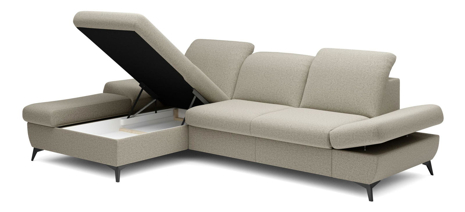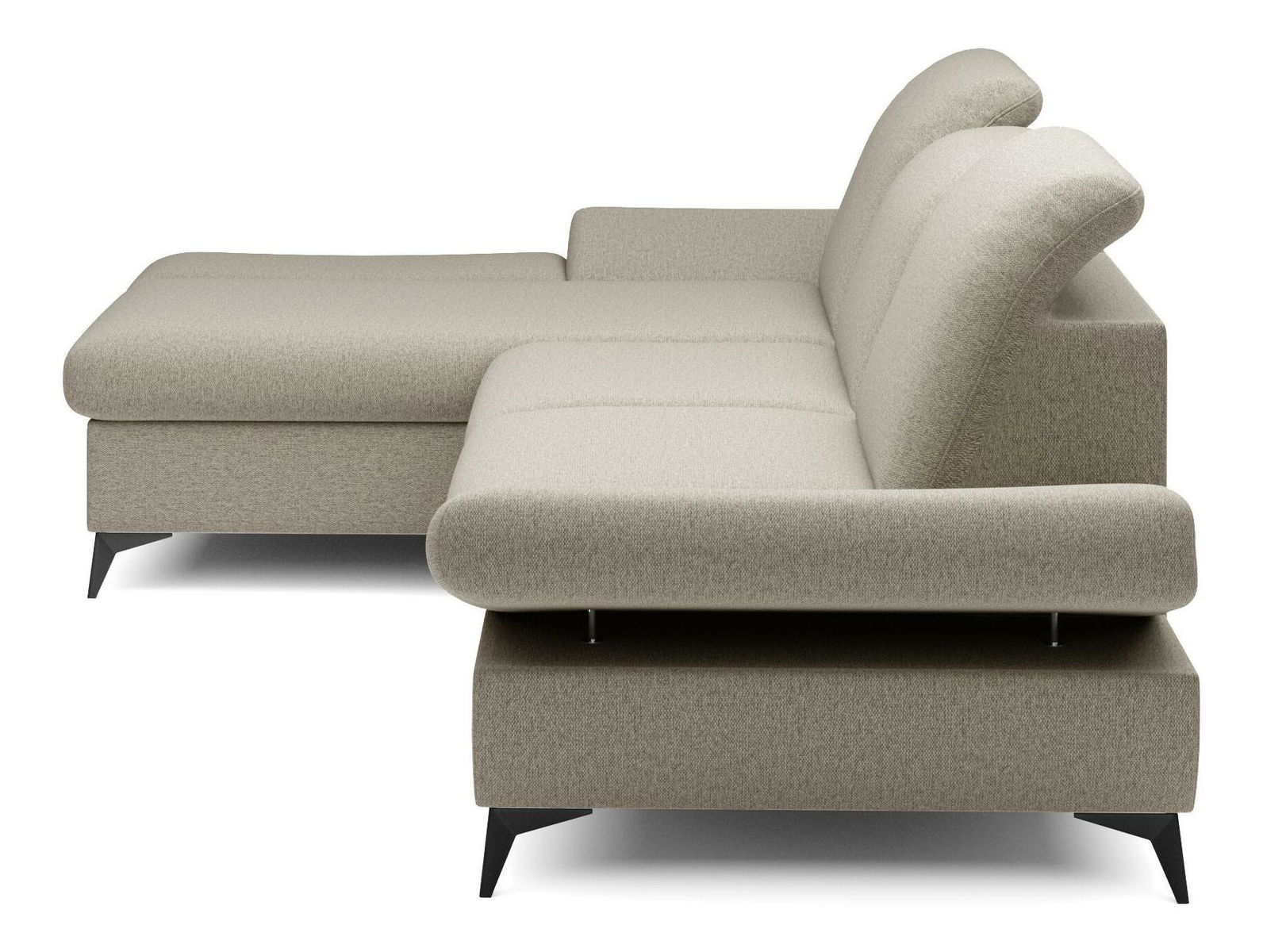 ZobrazitRohová sedačka je vyrobena z kvalitní konstrukce ze dřeva a dřevotřísky, což zaručuje pevnost a trvanlivost. Sedák je z PUR pěny a pružin, které poskytují maximální pohodlí při sezení. Sedačka je rozkládací a nabízí plochu na spaní o rozměrech 128 x 245 cm, ideální pro hosty nebo pro příležitostné přespání. Výška sezení je 42 cm, hloubka sezení 60 cm a výška područky lze nastavit od 42 cm do 57 cm, což umožňuje individuální nastavení podle potřeb uživatele. Sedačka disponuje úložným prostorem, kde můžete uschovat ložní prádlo nebo jiné věci. Hřbet sedačky je potažen stejnou látkou, čímž se dosahuje jednotného a elegantního vzhledu. Nastavitelné opěrky hlavy a područky zvyšují komfort sezení. Nožičky jsou kovové o výšce 10 cm, což dodává sedačce moderní vzhled a stabilitu. Typ rozkládání je vozík, což umožňuje snadné a rychlé rozkládání sedačky.