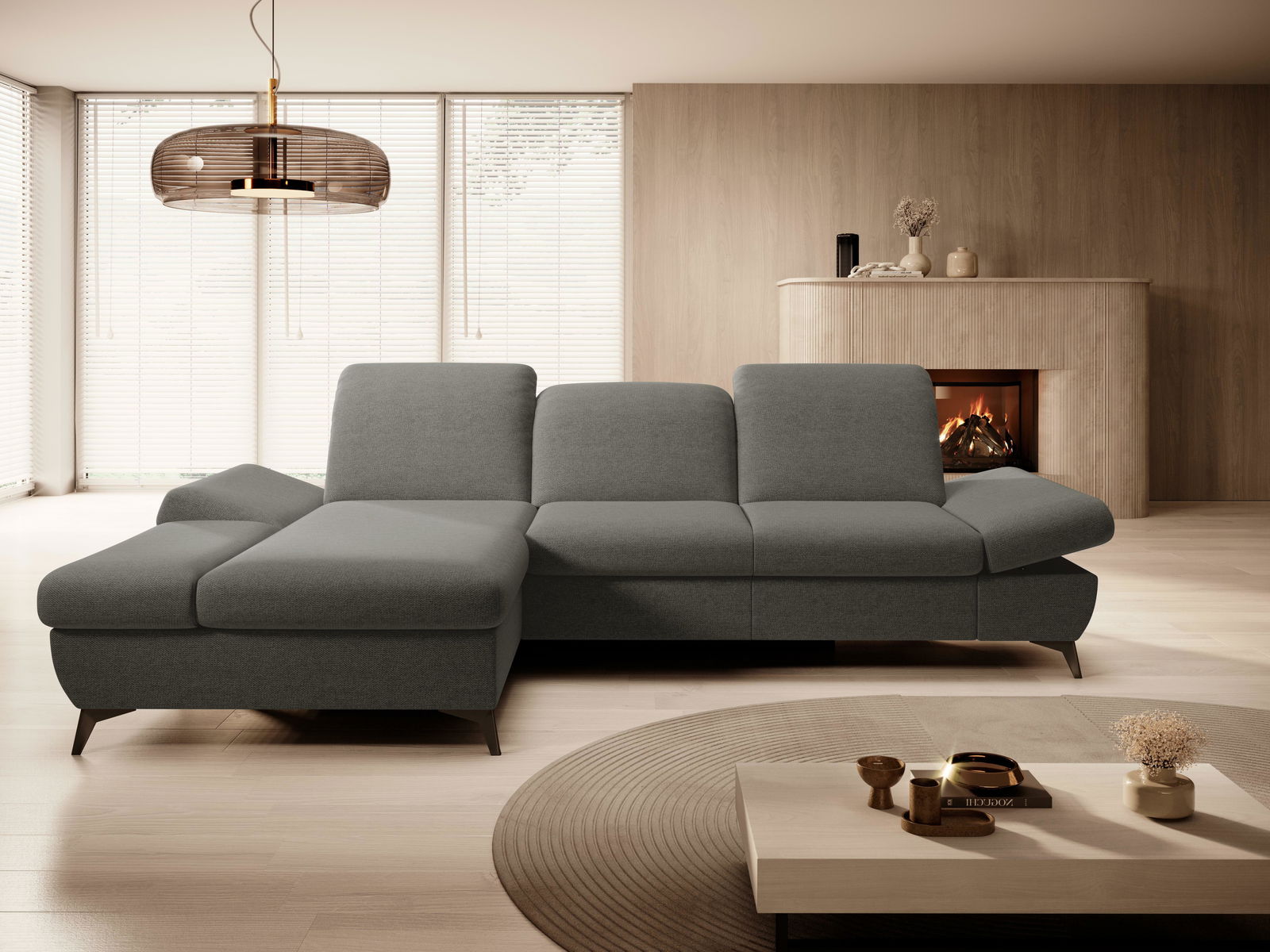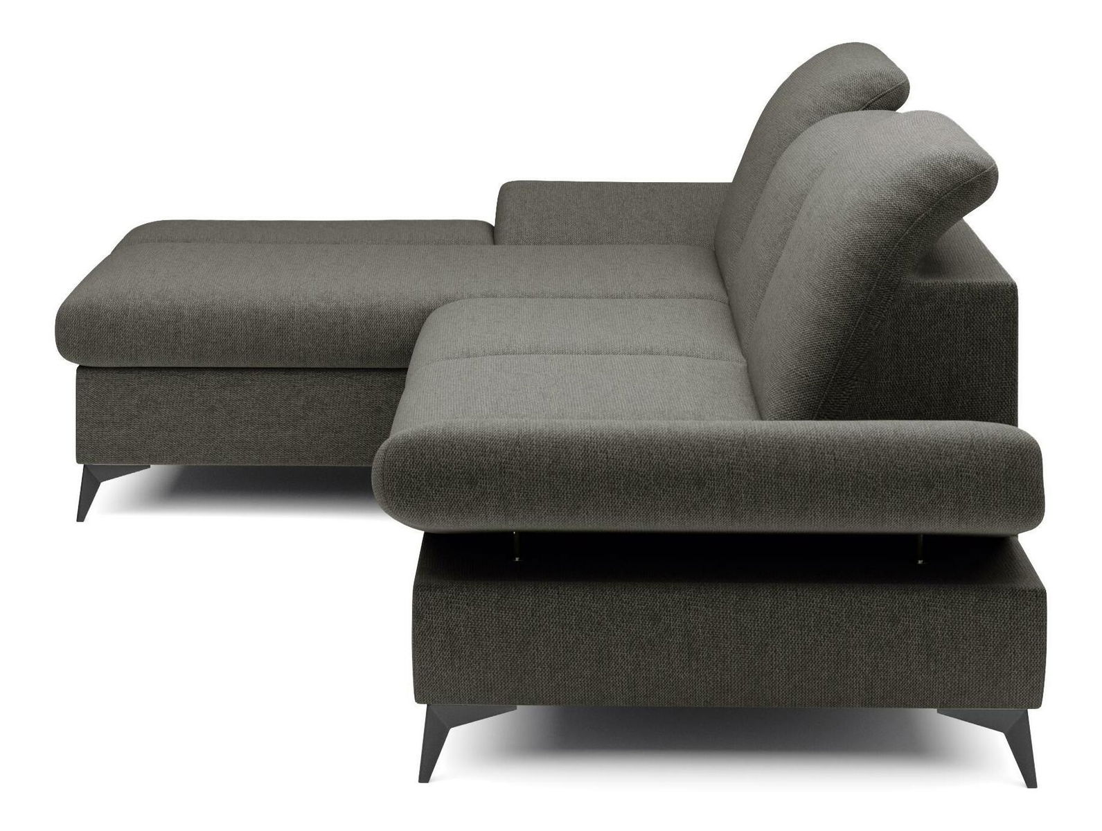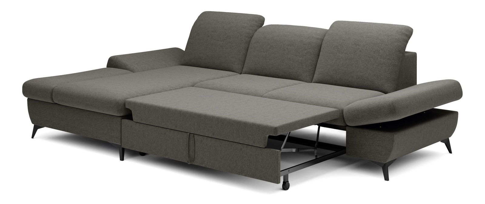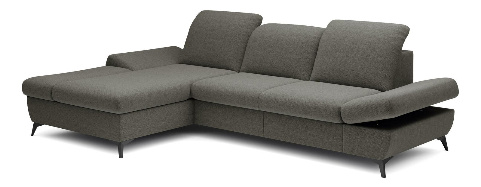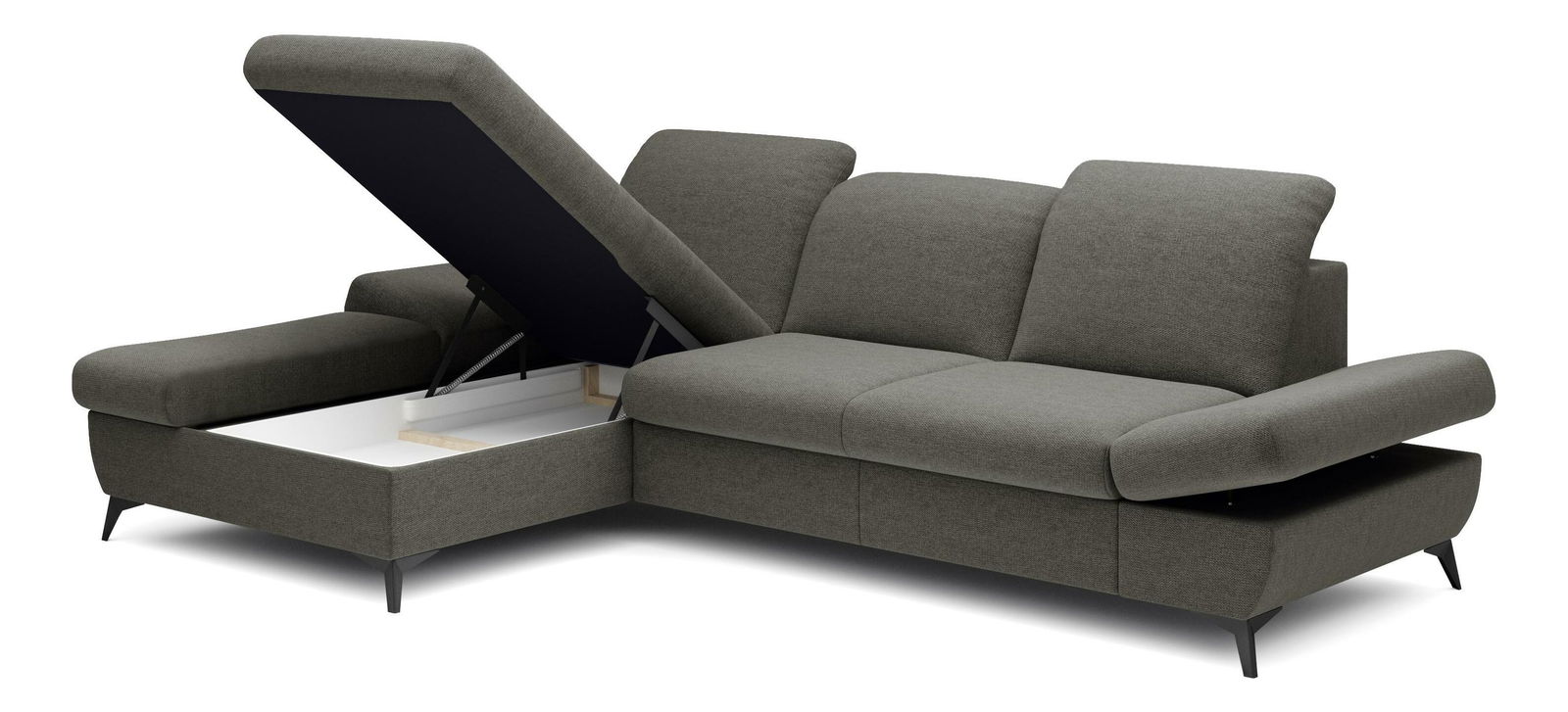 Rohová sedačka je vyrobena z kvalitní konstrukce ze dřeva a dřevotřísky, což zaručuje pevnost a trvanlivost. Sedák je z PUR pěny a pružin, které poskytují maximální pohodlí při sezení. Sedačka je rozkládací a nabízí plochu na spaní o rozměrech 128 x 245 cm, ideální pro hosty nebo pro příležitostné přespání. Výška sezení je 42 cm, hloubka sezení 60 cm a výška područky lze nastavit od 42 cm do 57 cm, což umožňuje individuální nastavení podle potřeb uživatele. Sedačka disponuje úložným prostorem, kde můžete uschovat ložní prádlo nebo jiné věci. Hřbet sedačky je potažen stejnou látkou, čímž se dosahuje jednotného a elegantního vzhledu. Nastavitelné opěrky hlavy a područky zvyšují komfort sezení. Nožičky jsou kovové o výšce 10 cm, což dodává sedačce moderní vzhled a stabilitu. Typ rozkládání je vozík, což umožňuje snadné a rychlé rozkládání sedačky.