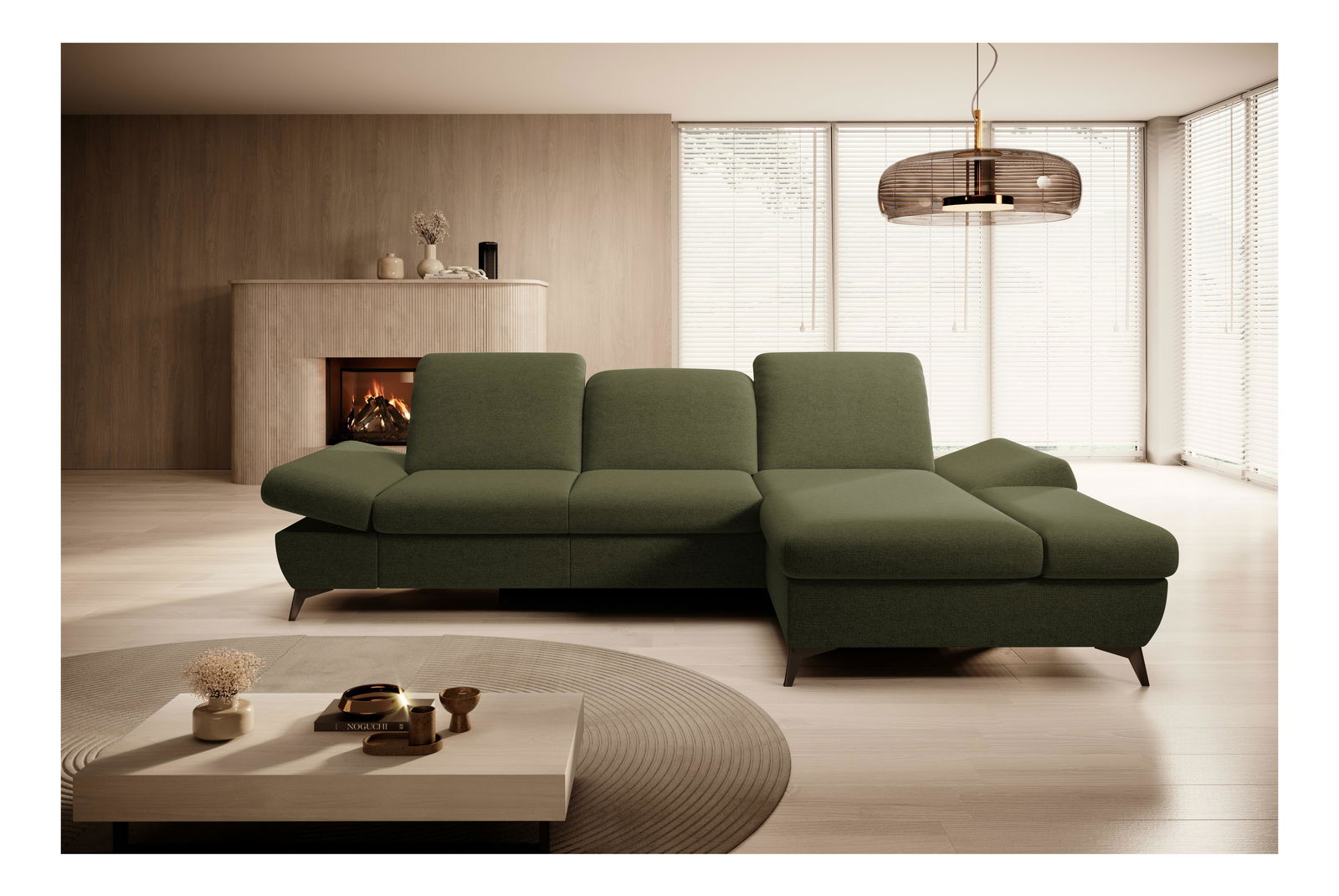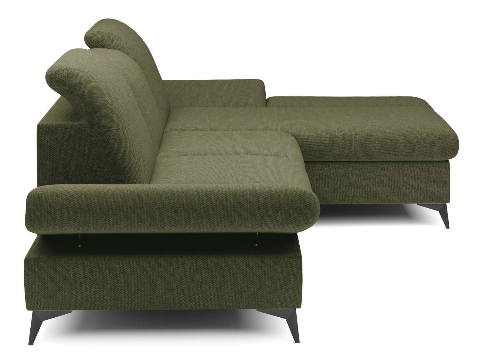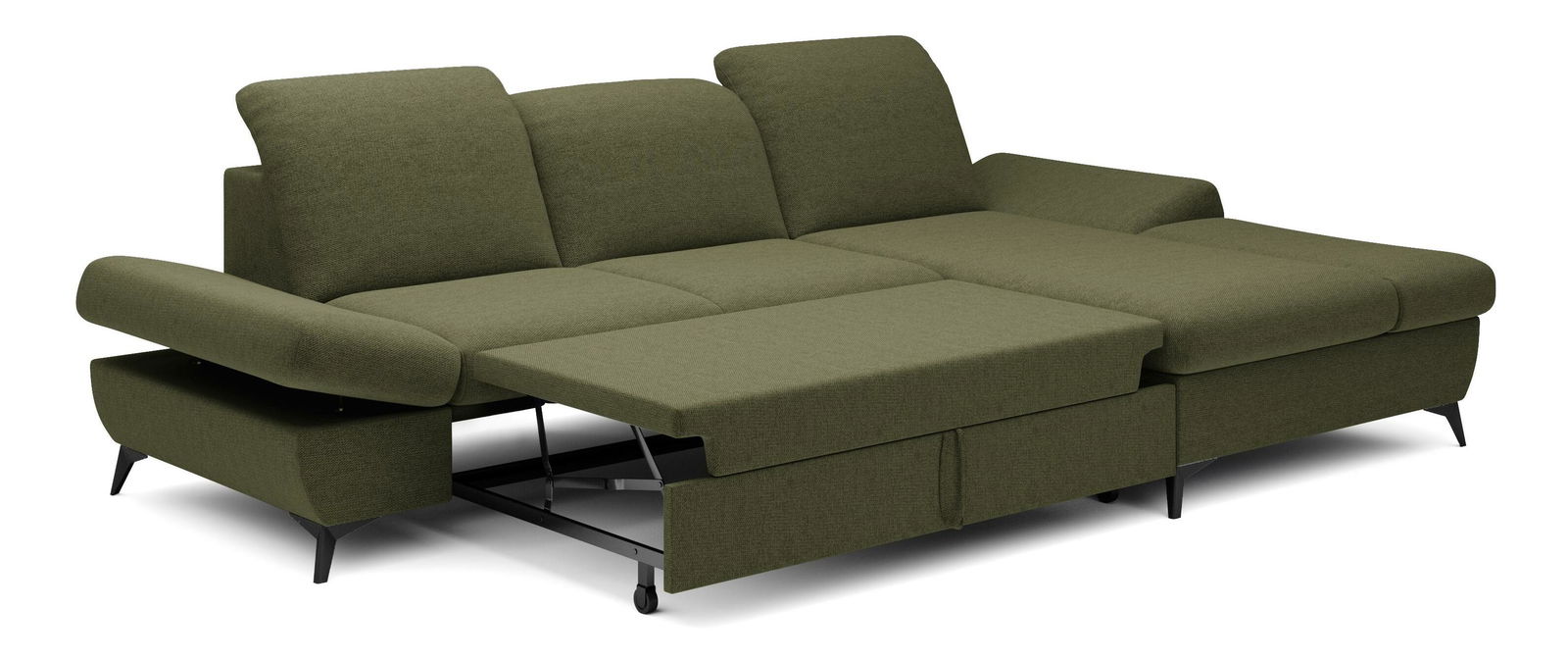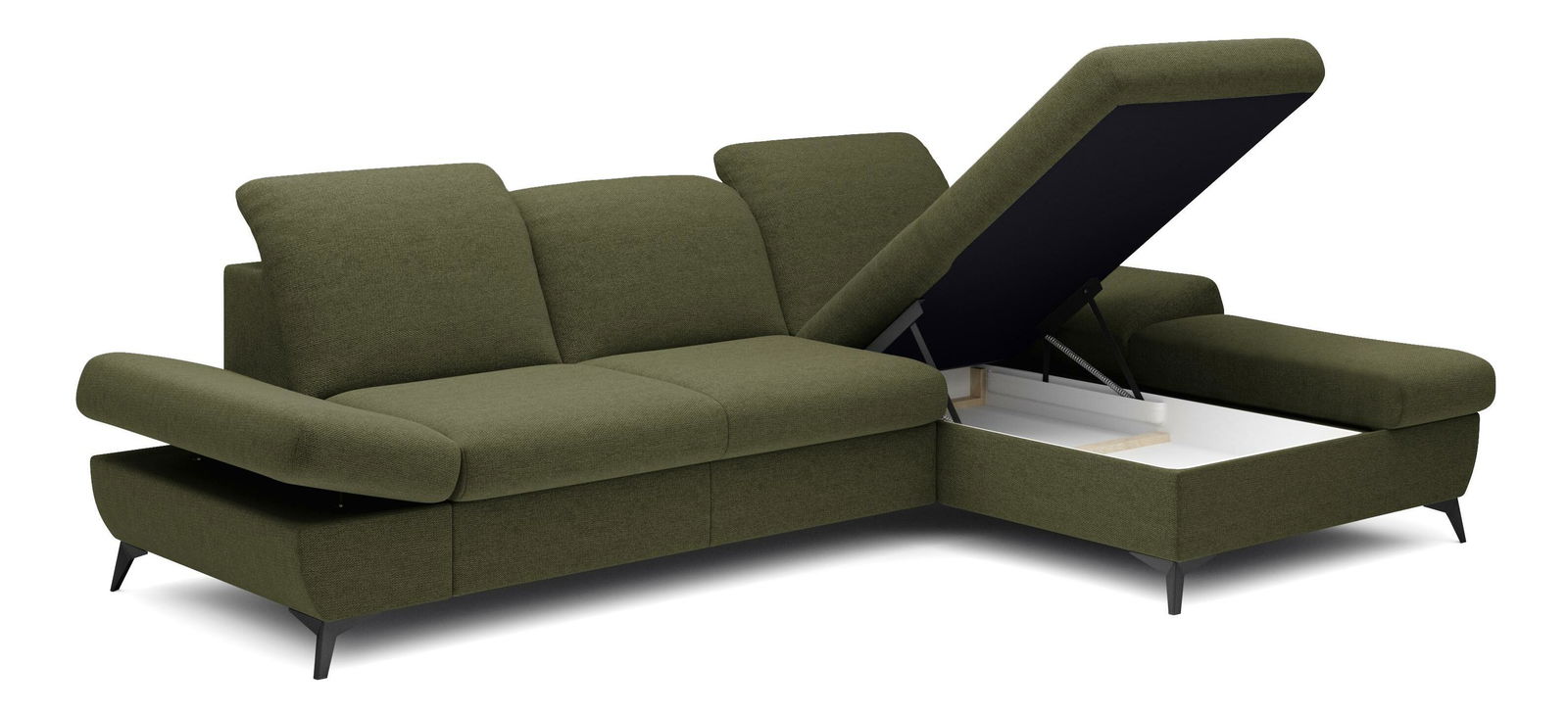 Rohová sedačka je vyrobena z kvalitní konstrukce ze dřeva a dřevotřísky, což zaručuje pevnost a trvanlivost. Sedák je z PUR pěny a pružin, které poskytují maximální pohodlí při sezení. Sedačka je rozkládací a nabízí plochu na spaní o rozměrech 128 x 245 cm, ideální pro hosty nebo pro příležitostné přespání. Výška sezení je 42 cm, hloubka sezení 60 cm a výška područky lze nastavit od 42 cm do 57 cm, což umožňuje individuální nastavení podle potřeb uživatele. Sedačka disponuje úložným prostorem, kde můžete uschovat ložní prádlo nebo jiné věci. Hřbet sedačky je potažen stejnou látkou, čímž se dosahuje jednotného a elegantního vzhledu. Nastavitelné opěrky hlavy a područky zvyšují komfort sezení. Nožičky jsou kovové o výšce 10 cm, což dodává sedačce moderní vzhled a stabilitu. Typ rozkládání je vozík, což umožňuje snadné a rychlé rozkládání sedačky.