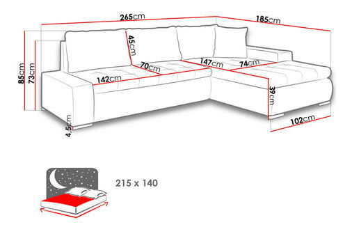 délka: 265 cm, šířka: 185 cm, výška: 85 cm, prostor na spaní: 215 x 140 cm, rozměry kontejneru: délka: 138 cm, šířka: 55 cm, výška: 21 cm