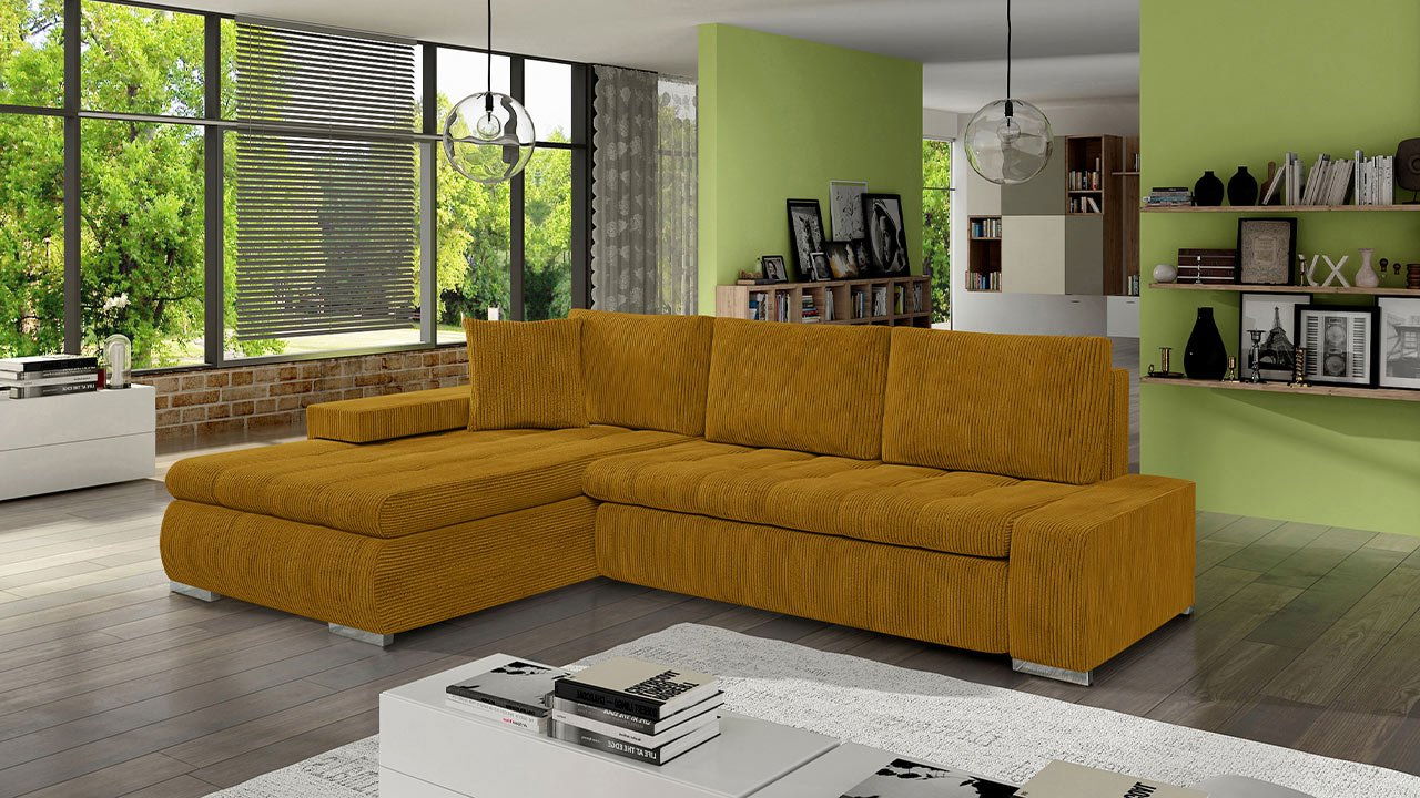 Volně stojící rohová sedačka nabízí spoustu. Od praktických řešení až po krásnou pruhovanou látku na čalounění. Ideální do obývacího pokoje. V případě potřeby může sloužit jako další prostor pro spaní. Je vytvořen z vysoce kvalitních komponentů a obohacený o užitečné funkce. Rohová pohovka je rozkládací, má plochu na spaní a nádobu na lůžkoviny. Opěrka zad je tvořena pohyblivými polštáři na zip. Součástí balení je také malý dekorativní polštářek. Celek je doplněn nízkými nožičkami. Jedná se o model, který bude ideální pro návštěvy hostů a jako součást obývacího pokoje kombinovaného s ložnicí.