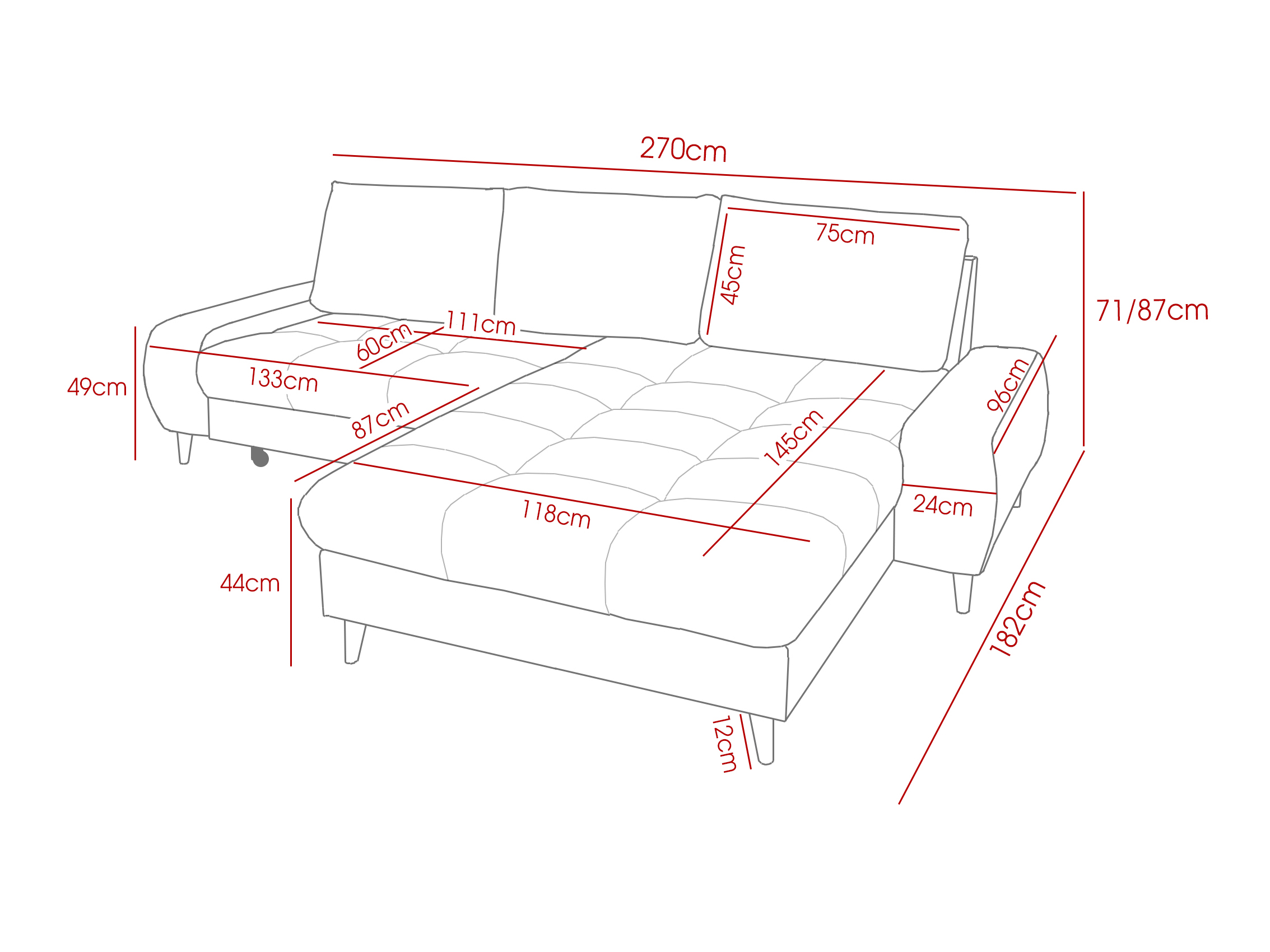 Rohová sedačka Hermon (L) (šedá) je ideálním řešením pro velké obývací pokoje, protože její rozměry jsou 182 x 225 cm. Je k dispozici v levém i pravém provedení a čalounění v látce se sametovým povrchem vytváří dojem luxusu. úložné prostory vedle sebe a výplň je kombinací pěny T30 a pružin Falliste, čímž se zaručuje maximální komfort. Sedátko má výšku 44 cm a hloubku sezení s polštáři 60-145 cm. velikosti 225 x 130 cm. Konstrukce je vyrobena ze dřeva a dřevovlákna a čalounění je ve tkanině Iness velvet. Test odolnosti tkaniny Martindale má hodnotu 80007. Sedačka je balena do tří balíků a vyžaduje montáž.