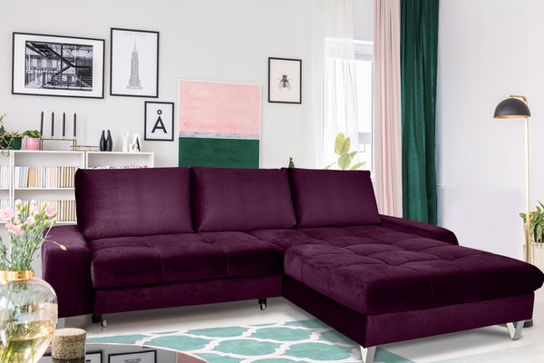 Hermon (P) (fialová) je stylová rohová sedačka, která je dostupná v levém i v pravém provedení. Čalounění v látce se sametovým povrchem přináší luxusní pocit. Sedačka má dvě úložné prostory vedle sebe a je rozkládací, což ji činí praktickou pro hosty. Maximální komfort zajišťují výplně pěny T30 a pružin Falliste. Sedačka má přední nožičky ve tvaru písmene V a pod sedáky jsou kolečka, která umožňují vytvořit plochu na spaní. Konstrukce je vyrobena z dřevotřísky o tloušťce 16 mm, dřevovláknité desky a překližky, zatímco nožičky jsou vpředu kovové a vzadu plastové. Výška sezení je 44 cm a hloubka sezení s polštáři se pohybuje od 60 do 145 cm. Výška sedačky po opěrky je 49 cm a šířka opěrky je 24 cm. Hermon (P) má tři polštáře a je čalouněna v tkanině Iness velvet. Test oděruvzdornosti Martindale této tkaniny je vysoký. Sedačka má 3 balíky a váží 110,12 kg.