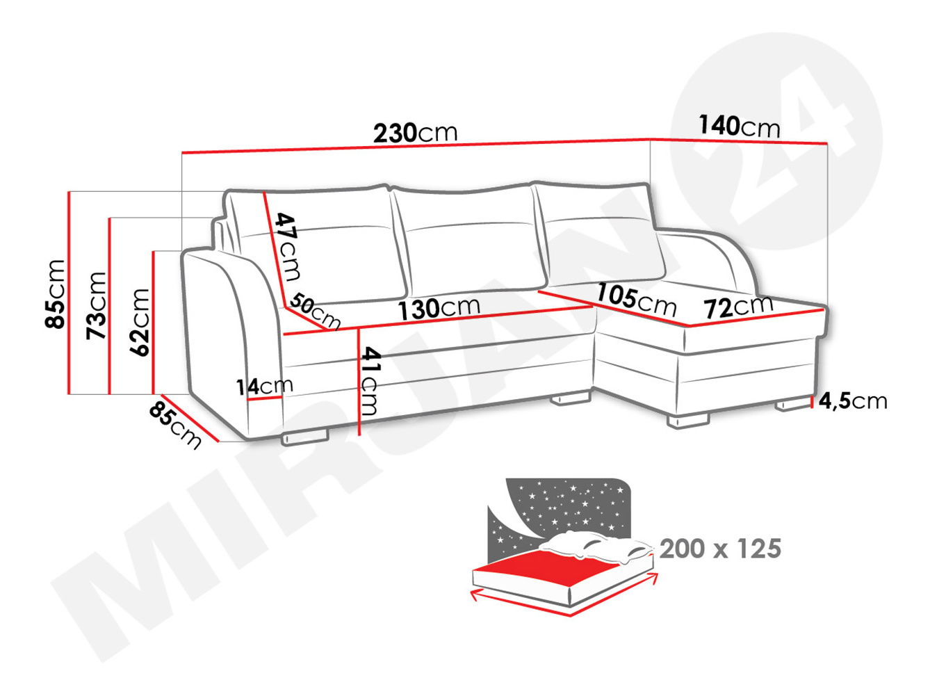 ZobrazitRohová sedací souprava je ideální volbou pro ty, kteří hledají pohodlí a styl. Rozměry: délka: 230 cm šířka: 140 cm výška: 85 cm rozměr rozložené plochy: 200x125 cm T25/42, pružiny bonell, s úložným prostorem, funkce rozložení, polštáře na zip, přední nožičky jsou dřevěné barva wenge, na zadní straně plastové nožičky, opěrka je ve formě polštářů, v ceně jsou zahrnuty polštáře, polštáře na zip, zadní část sedačky je2 - šířka: 62 cm, - výška: 22 cm Záruční doba: 24 měsíců