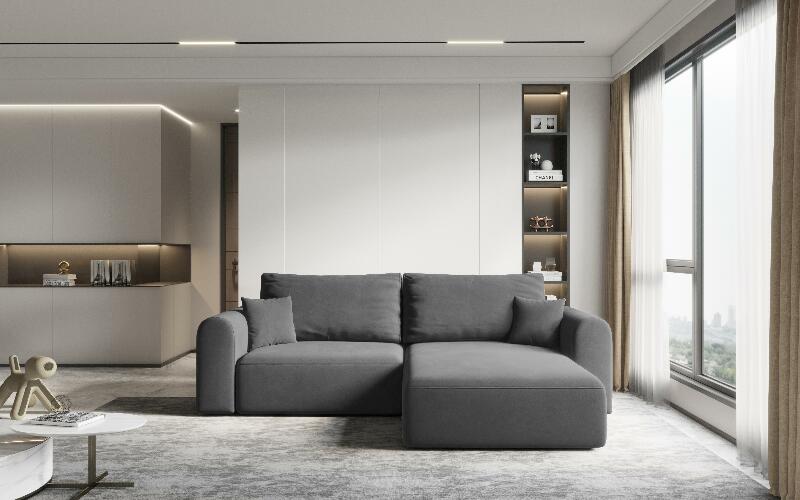 Vychutnejte si chvíle pohody a relaxu při knize či sledování oblíbeného seriálu v televizi na této elegantní rohové sedačce Karimo. Oblejší tvary přinesou do vašeho obývacího pokoje přitažlivost a zútulní ji. Sedačku lze v případě potřeby i rozložit a lze tak využít k příležitostnému přespání. Sedačka disponuje také úložným prostorem, kam si můžete uložit ložní prádlo a polštáře.