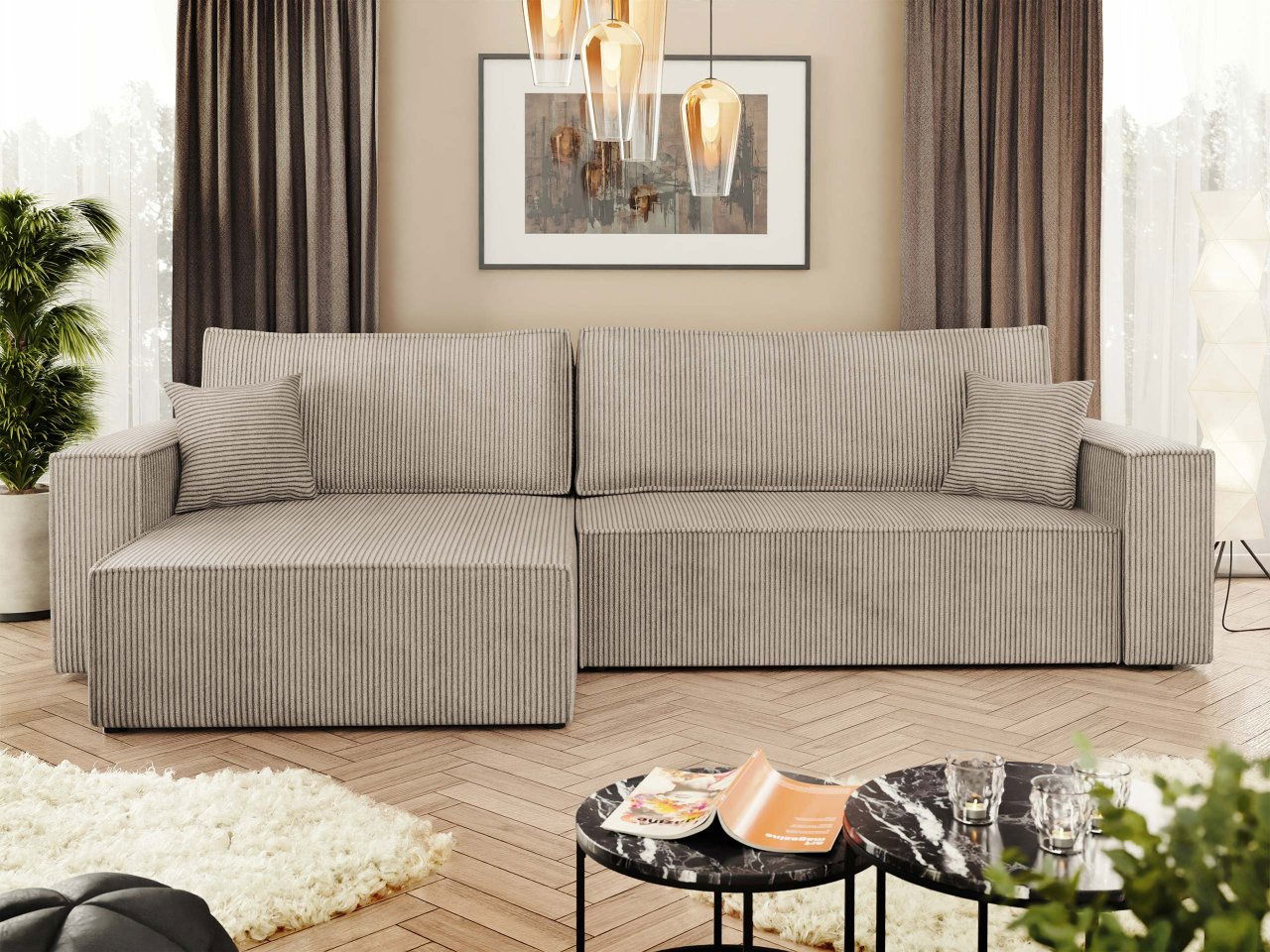 ZobrazitRohová sedačka je ideální volbou pro ty, kdo hledají pohodlí a styl. Moderní rohová sedačka Kasjusz Maxi z manšestrové látky spojuje stylový vzhled a funkčnost. Designový charakter nábytku zvýrazňuje především módní látka. Jemný a na dotek příjemný samet s drážkami je hitem – je mimořádně oblíbený mezi lidmi, kteří si vybírají čalouněný nábytek. V modelu Kasjusz Maxi jej doplňují ozdobné lemovky – zdůrazňují charakteristický tvar těla. Další výhodou rohové sedačky s funkcí spánku je prostorný úložný prostor pro lůžkoviny. Tato skrytá přihrádka pod sedadlem skvěle poslouží i jako náhradní nádoba např. pro sezónní oblečení nebo cestovní tašky. Rozměry: délka: 272 cm, šířka: 145 cm, výška: 82 cm, Spací plocha: 230 x 125 cm rozměry úložného prostoru: délka: 128 cm, šířka: 61 cm, výška: 22 cm Rohová strana: univerzální (stranu si volí zákazník při montáži) Provedení: rám dřevotříska, sedák a opěradlo: 9 cm silná pěna T30 + vlnová pružina "typ A", otoman: pěna T30, tloušťka 9 cm, rozkládací rohová pohovka, má funkci spánku, úložný prostor, nohy: cylindrické PVC, černé, opěradlo ve formě pohyblivých polštářů stojící rohová pohovka (záda potažená látkou) Záruka: 24 měsíců