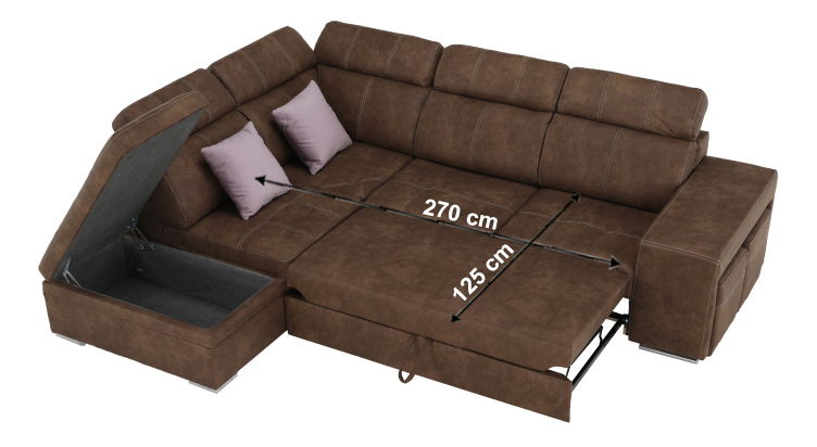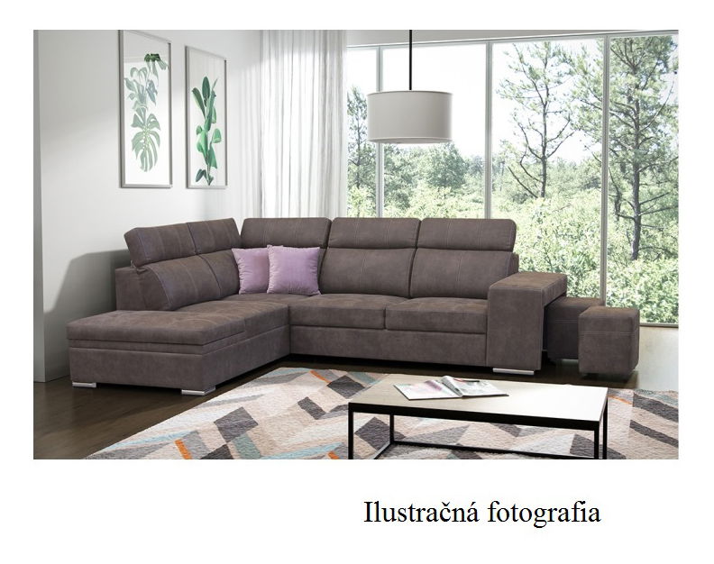 Stylová rohová sedačka Lanza s polohovacím záhlavím vám poskytne komfort o jakém jste vždy snili. Součást sedačky jsou také 2 taburetky, které jsou zasunuty pod opěrka ruky a vpřípadě poteby je můžete použít k sezení ale vyložení nohou. Sedačka je rozkládací s úložným prostorem a plocha spaní má rozměry 120 x 190 cm. Vybrat si můžete barvu čalounění sedačky i polštářů. Dostupné levé i pravé provedení.