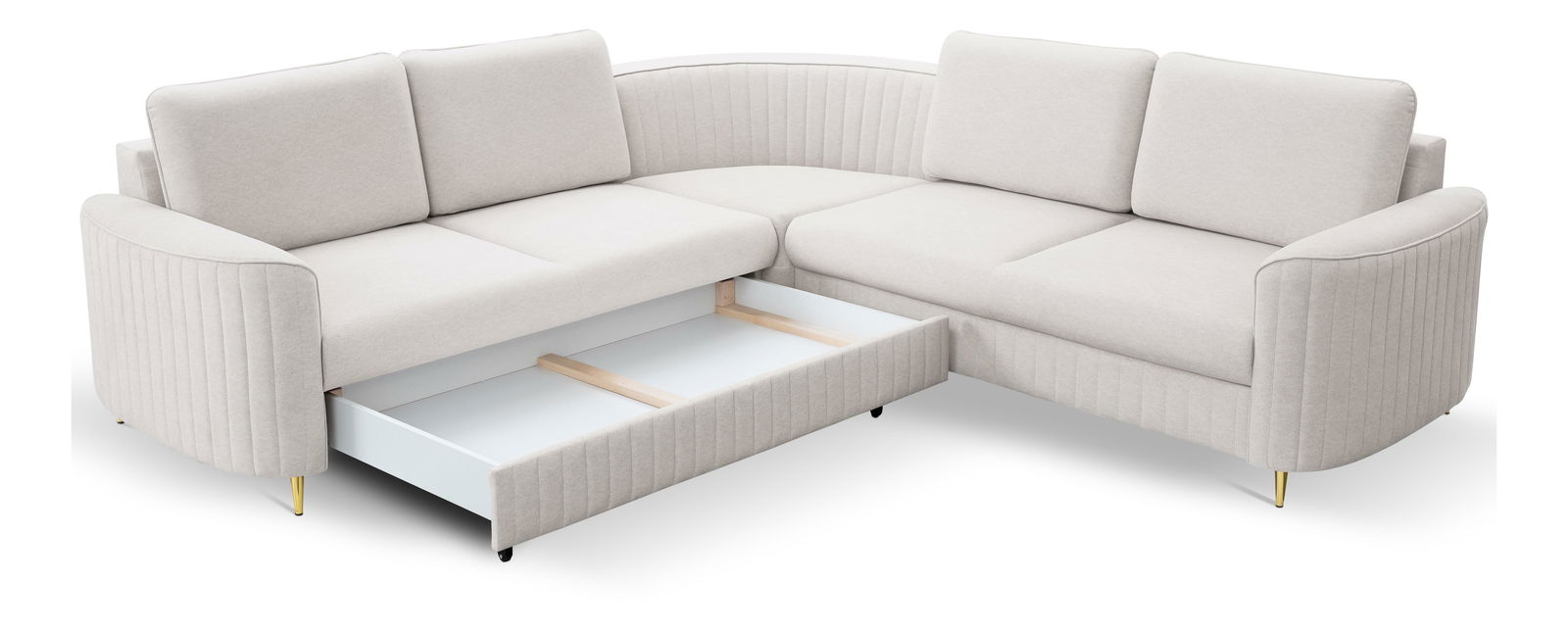 ZobrazitRohová sedací souprava s konstrukcí ze dřeva, dřevotřísky a překližky nabízí pevnost a dlouhou životnost. Sedáky z PUR pěny a pružin zajišťují vysoký komfort. Rozkládací plocha na spaní má rozměry 150 x 212 cm. Výška sezení je 41 cm, hloubka 59 cm a výška područky 57 cm. Souprava obsahuje úložný prostor a záda jsou potažena stejnou látkou, čímž se dosahuje jednotného vzhledu. Nastavitelné opěrky hlavy a područky chybí. Kovové nožičky o výšce 10 cm zaručují stabilitu. Typ rozkládání je vozík a čalounění je z kvalitní tkaniny Castel.