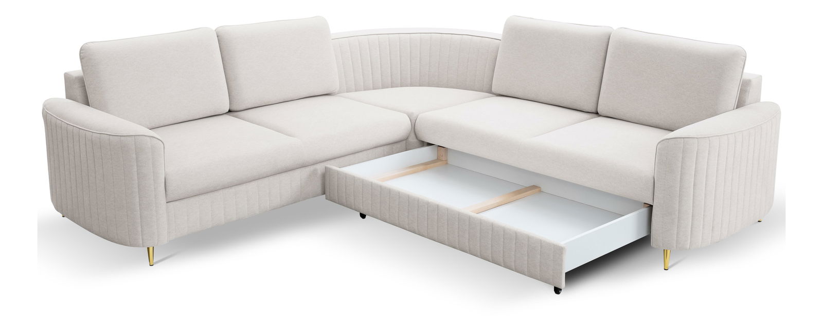 ZobrazitRohová sedací souprava s konstrukcí ze dřeva, dřevotřísky a překližky nabízí pevnost a dlouhou životnost. Sedáky z PUR pěny a pružin zajišťují vysoký komfort. Rozkládací plocha na spaní má rozměry 150 x 212 cm. Výška sezení je 41 cm, hloubka 59 cm a výška područky 57 cm. Souprava obsahuje úložný prostor a záda jsou potažena stejnou látkou, čímž se dosahuje jednotného vzhledu. Nastavitelné opěrky hlavy a područky chybí. Kovové nožičky o výšce 10 cm zaručují stabilitu. Typ rozkládání je vozík a čalounění je z kvalitní tkaniny Castel.