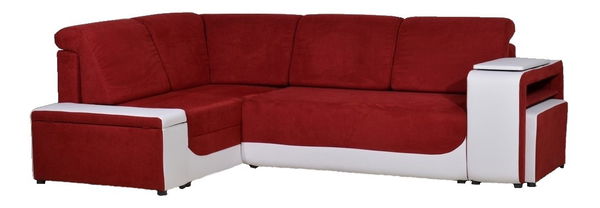 Moderní rohová sedačka s praktickými vychytávkami. V nižší područce se nachází úložný prostor, pod vyšší područce je umístěna taburetka. Na područce se ještě nachází polička a navrchu odkládací otočná tácek. Sedačku v případě potřeby jednoduchým pohybem rozložíte Pohodlné sezení zaručují bonellové pružiny s PUR pěnou. Kombinace materiálů čalounění je ekokůže s látkou.