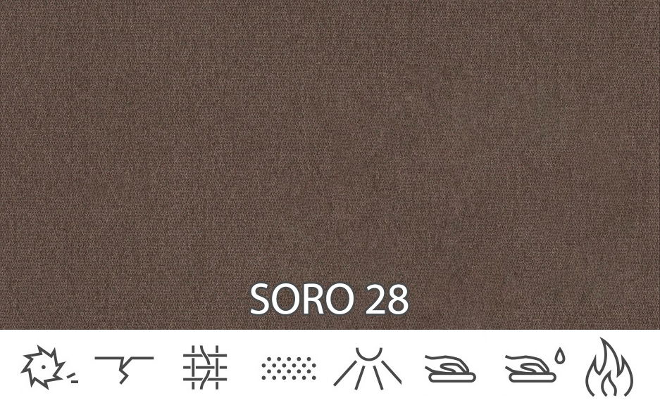 Látka Soro je velurová potahová látka vyrobená ze 100% polyesteru o struktuře pletení. Je to měkká a na dotek jemná a příjemná potahová látka, která se neroztáhne. Získala vysoký výsledek v testu Martindale, až 100 000 cyklů. Znamená to, že je otěruvzdorná a nezůstanou v ní díry ani po několika letech používání. Látky s tímto výsledkem jsou zařazeny do materiálů vhodných pro použití na veřejných místech – například v autobusech. Odolává vůči častému používání. Látka Soro splnila směrnici Reach, díky čemuž neobsahuje škodlivé chemikálie.