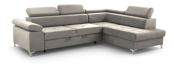 Rohová sedací souprava - Madeira (béžová) (P) je moderní sedací souprava s rámem z masivního dřeva a dřevotřísky. Nabízí pohodlné sezení díky bonellové pružině a pěně T 30. Opěrky jsou vyrobeny z kombinace pěny, silikonu a jsou doplněny potahovými lištami pro maximální komfort. Tato multifunkční sedačka má rozkládací mechanismus typu "delfín" a je vybavena úložným prostorem. Plocha na spaní má rozměry 127x203 cm, pro pohodlný odpočinek. Zadní strana sedačky je potažena stejnou látkou jako přední, což umožňuje její umístění do středu místnosti. Sedací souprava je dostupná ve tvaru "L". Regulovatelné opěrky, včetně opěrek hlavy a loktů, zvyšují komfort při sezení, přičemž výška sedačky se zvednutou loketní opěrkou je 76 cm as opěrkou hlavy 95 cm.