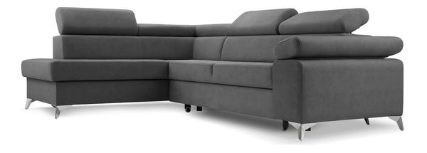 Rohová sedací souprava - Madeira (grafit) (L) je moderní sedací souprava ve tvaru "L" s rámem z masivního dřeva a dřevotřísky. Nabízí pohodlné sezení díky bonellové pružině a pěně T 30. Opěrky jsou vyrobeny z kombinace pěny, silikonu a jsou doplněny potahovými lištami pro maximální komfort. Tato multifunkční sedačka má rozkládací mechanismus typu „delfín“ a úložný prostor. Plocha na spaní má rozměry 127x203 cm. Zadní strana sedačky je potažena stejnou látkou jako přední, což umožňuje její umístění do středu místnosti. Sedací souprava má regulovatelné opěrky hlavy a loktů, s výškou sedáku 76 cm as opěrkou hlavy 95 cm.