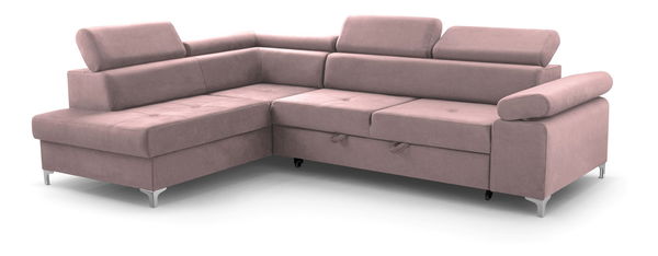 Rohová sedací souprava - Madeira (růžová) (L) je moderní sedací souprava s rámem z masivního dřeva a dřevotřísky. Nabízí pohodlné sezení díky bonellové pružině a pěně T 30. Opěrky jsou vyrobeny z pěny, silikonu a jsou doplněny potahovými lištami, což zajišťuje maximální komfort. Tato multifunkční sedačka má rozkládací mechanismus typu "delfín" a je vybavena úložným prostorem. Plocha na spaní má rozměry 127x203 cm, což poskytuje dostatečný prostor pro pohodlný odpočinek. Zadní strana sedačky je potažena stejnou látkou jako přední, což umožňuje její umístění do středu místnosti. Sedací souprava je dostupná ve tvaru "L". Regulovatelné opěrky, včetně opěrek hlavy a loktů, zvyšují komfort při sezení, přičemž výška sedačky se zvednutou loketní opěrkou je 76 cm as opěrkou hlavy 95 cm.