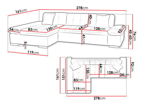 Rohová sedací souprava je ideální volbou pro ty, kteří hledají pohodlí a styl. Rohová pohovka Magnir je kus nábytku, který vnese do vašeho okolí závan svěžesti a umožní vám pohodlně si odpočinout po celodenní práci. Bude centrem odpočinku a rodinných setkání. Zajímavé kombinace různých odstínů poskytnou neomezené možnosti designu. Tento model nabízí také nastavitelné područky, které výrazně zvyšují kvalitu používání. Souprava obsahuje také polštáře na zip. Rohová sedačka do obývacího pokoje je volně stojící. Díky tomu si své interiéry zařídíte bez problémů a v souladu s vlastní aranžérskou vizí. Rozměry: délka: 278 cm, šířka: 161 cm, výška: 76 cm Rohová strana: levá nebo pravá Provedení: dřevěný rám + dřevotříska, polyuretanová pěna + vlnová pružina, bez funkce spánku, bez úložného prostoru, polštáře v ceně, polštáře na zip, chromované plast látkou), nastavení loketní opěrky Záruka: 24 měsíců