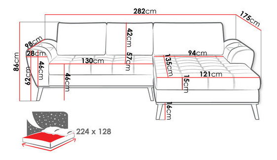 ZobrazitRozkládací rohová pohovka je ideální volbou pro ty, kteří hledají pohodlí a styl. Rozkládací pohovka Mitidera je mimořádně pohodlný a originální kus nábytku, který je vybaven praktickými funkcemi. Má nádobu na lůžkoviny a funkci spaní, takže spojuje pohodlí a funkčnost. Díky funkci automatického rozkládání můžete rohovou pohovku rychle a jednoduše přeměnit na místo pro každodenní odpočinek. Opěrka zad je tvořena pohyblivými polštáři s pěnovou výplní, které jsou měkké a pohodlné. Po stranách nábytku jsou dřevěné poličky, které se výborně hodí k sezení v kině - můžete na ně pohodlně položit sklenici s nápojem nebo misku s občerstvením. Moderní rohová pohovka Mitidera se vyznačuje zajímavým designem. Prošívané sedátko mu dodává neobvyklý vzhled, zatímco vysoké dřevěné nohy dodávají nábytku lehkost. Najde si senzační místo ve stylově zařízeném obývacím pokoji. Rozměry: délka: 282 cm, šířka: 175 cm, výška: 86 cm, plocha na spaní: 224 x 128 cm, rozměry kontejneru: délka: 127 cm, šířka: 62 cm, výška: 14 cm Rohová strana: levá nebo pravá Provedení: rám: borová dřeva N30, opěradlo: polyuretanová pěna N2444, rohová pohovka je rozkládací, má funkci spánku, automatické usnadnění rozkládání, typ DL, nádoba na lůžkoviny, vysoké dřevěné nohy, po stranách nábytku jsou malé dřevěné poličky o rozměrech 27 x 17 cm, opěradlo ve formě pohyblivých polštářů, van stojící rohová jednotka (zadní část čalouněná látkou) Záruka: 24 měsíců