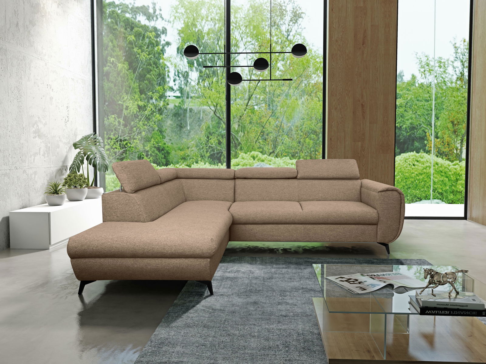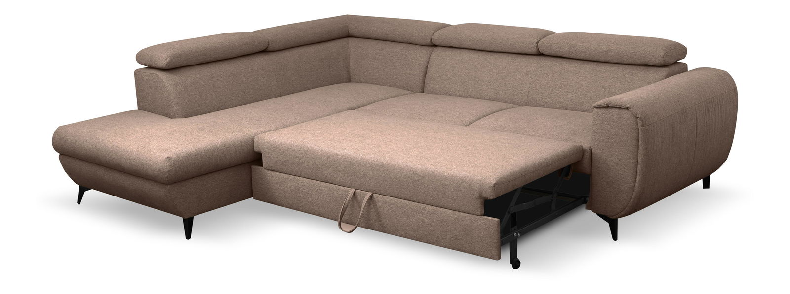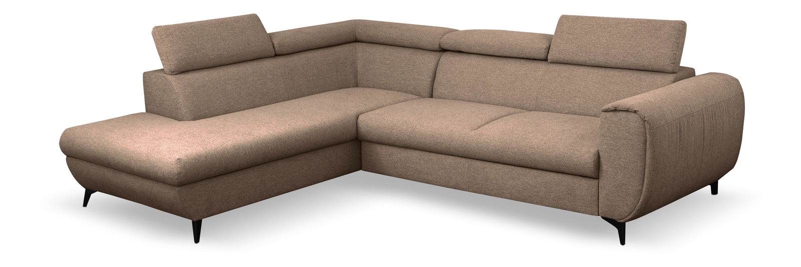Rohová sedací souprava je vyrobena z kvalitních materiálů, jako jsou dřevo, dřevotříska a překližka, což zajišťuje pevnost a dlouhou životnost. Sedák je tvořen PUR pěnou a pružinami, které poskytují vynikající komfort při sezení. Tato souprava je rozkládací a nabízí plochu na spaní o rozměrech 128 x 195 cm, ideální pro hosty nebo příležitostné přespání. Výška sezení je 41 cm, hloubka sezení 62 cm a výška područky je 62 cm, což zaručuje pohodlné a ergonomické sezení. Souprava disponuje úložným prostorem, který poskytuje dostatek místa pro uložení ložního prádla nebo jiných věcí. Hřbet je potažen stejnou látkou, což dodává sedací soupravě jednotný a elegantní vzhled. Nastavitelné opěrky hlavy přispívají k ještě většímu komfortu. Nožičky jsou kovové o výšce 10 cm, což zaručuje stabilitu a moderní vzhled. Typ rozkládání je vozík, což umožňuje snadné a rychlé rozkládání sedačky.
