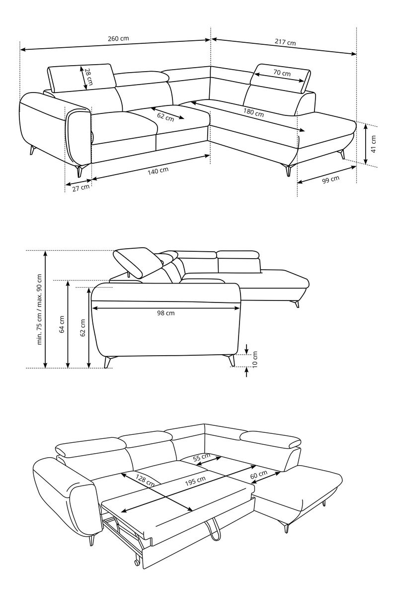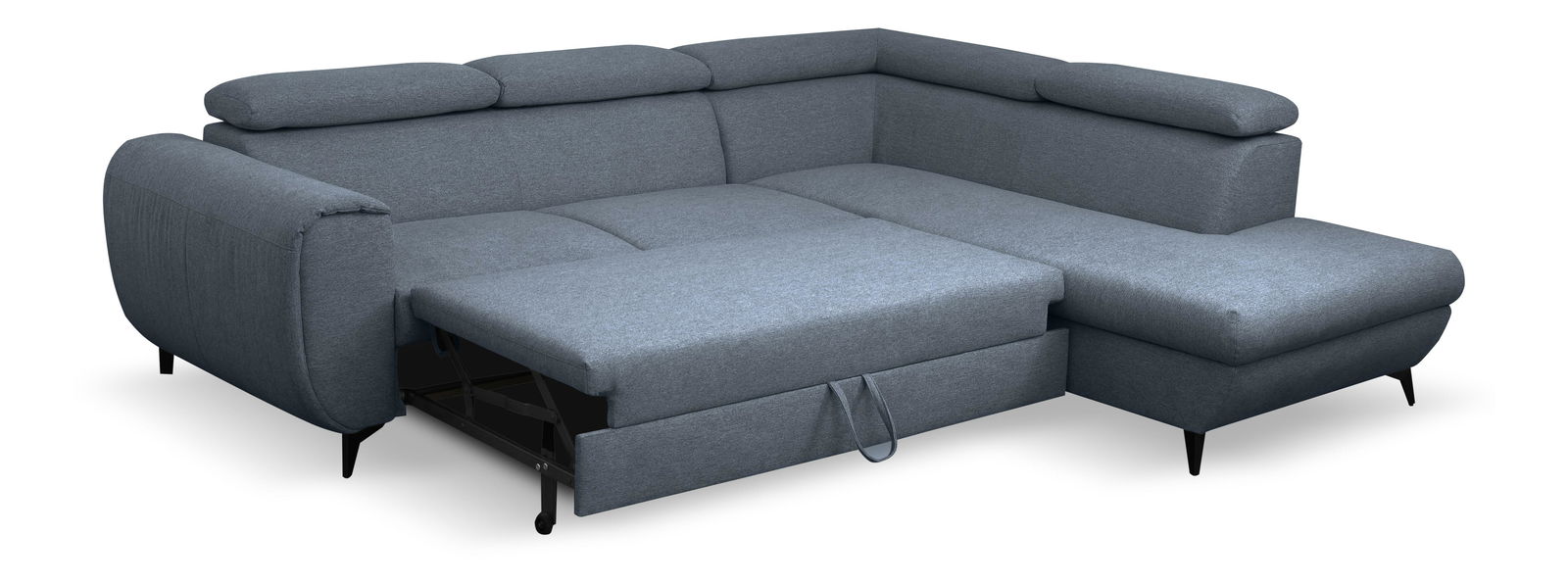 ZobrazitRohová sedací souprava je vyrobena z kvalitních materiálů, jako jsou dřevo, dřevotříska a překližka, což zajišťuje pevnost a dlouhou životnost. Sedák je tvořen PUR pěnou a pružinami, které poskytují vynikající komfort při sezení. Tato souprava je rozkládací a nabízí plochu na spaní o rozměrech 128 x 195 cm, ideální pro hosty nebo příležitostné přespání. Výška sezení je 41 cm, hloubka sezení 62 cm a výška područky je 62 cm, což zaručuje pohodlné a ergonomické sezení. Souprava disponuje úložným prostorem, který poskytuje dostatek místa pro uložení ložního prádla nebo jiných věcí. Hřbet je potažen stejnou látkou, což dodává sedací soupravě jednotný a elegantní vzhled. Nastavitelné opěrky hlavy přispívají k ještě většímu komfortu. Nožičky jsou kovové o výšce 10 cm, což zaručuje stabilitu a moderní vzhled. Typ rozkládání je vozík, což umožňuje snadné a rychlé rozkládání sedačky.