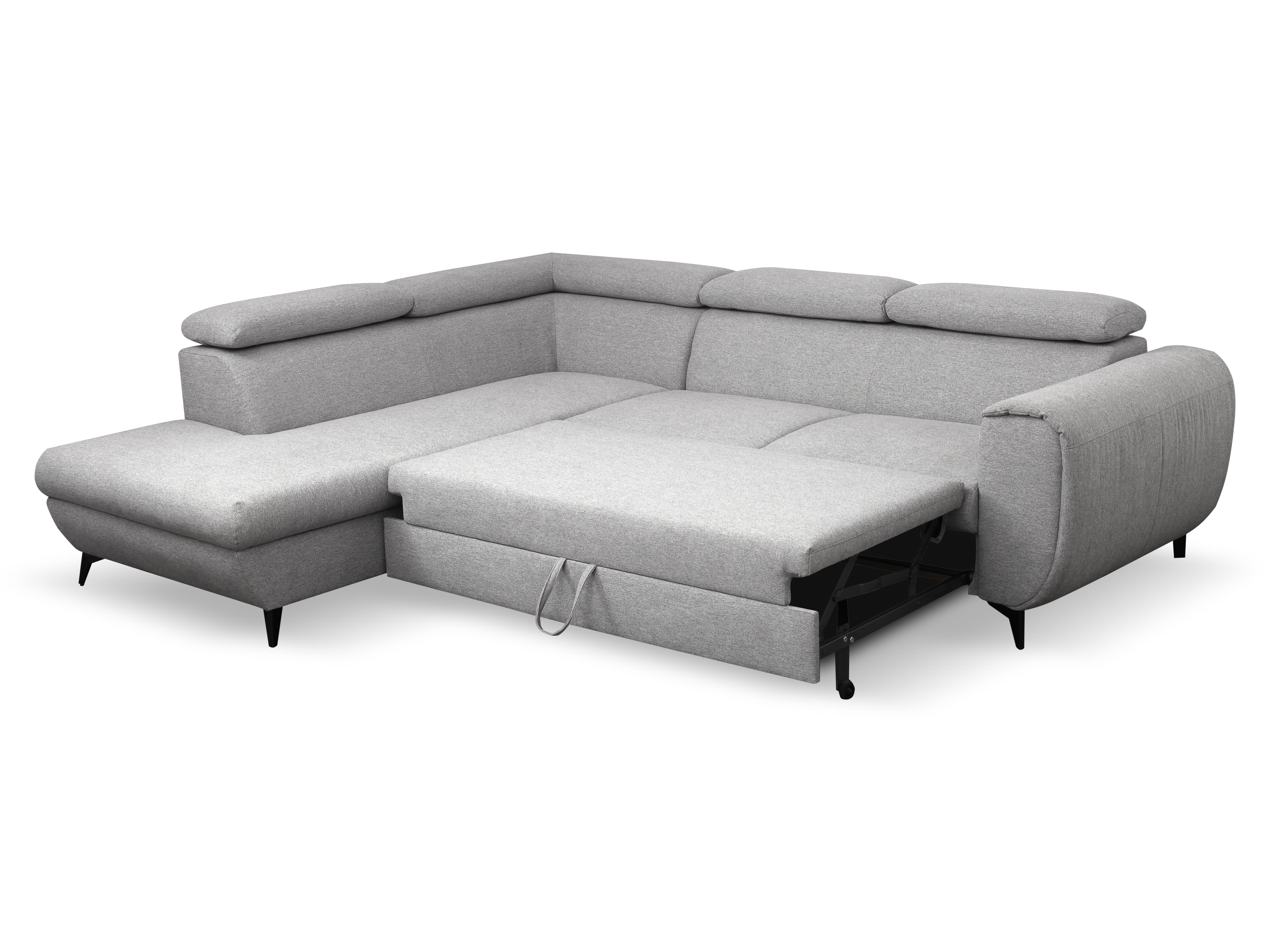 Rohová sedací souprava je vyrobena z kvalitních materiálů, jako jsou dřevo, dřevotříska a překližka, což zajišťuje pevnost a dlouhou životnost. Sedák je tvořen PUR pěnou a pružinami, které poskytují vynikající komfort při sezení. Tato souprava je rozkládací a nabízí plochu na spaní o rozměrech 128 x 195 cm, ideální pro hosty nebo příležitostné přespání. Výška sezení je 41 cm, hloubka sezení 62 cm a výška područky je 62 cm, což zaručuje pohodlné a ergonomické sezení. Souprava disponuje úložným prostorem, který poskytuje dostatek místa pro uložení ložního prádla nebo jiných věcí. Hřbet je potažen stejnou látkou, což dodává sedací soupravě jednotný a elegantní vzhled. Nastavitelné opěrky hlavy přispívají k ještě většímu komfortu. Nožičky jsou kovové o výšce 10 cm, což zaručuje stabilitu a moderní vzhled. Typ rozkládání je vozík, což umožňuje snadné a rychlé rozkládání sedačky.