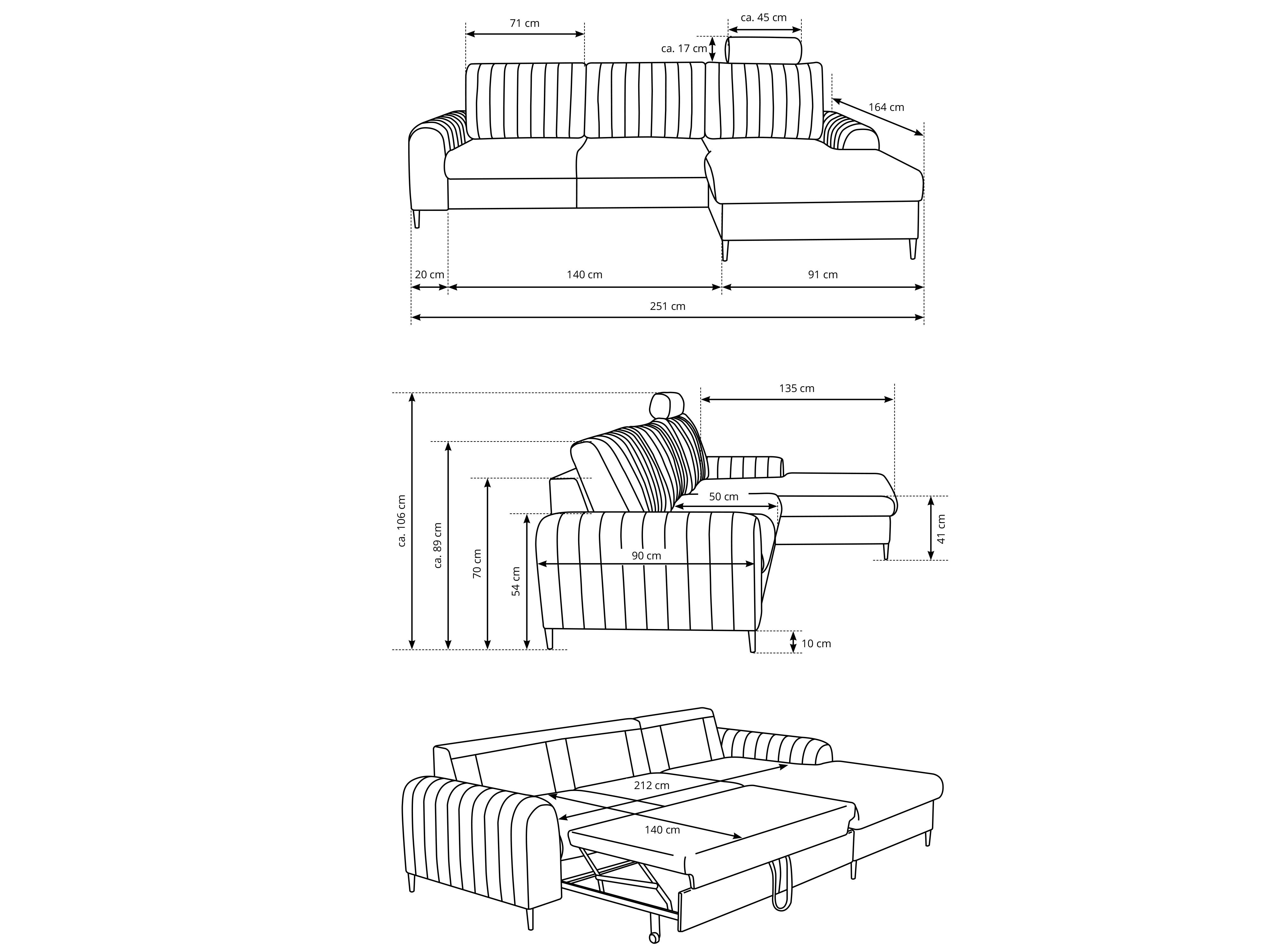 ZobrazitRohová sedací souprava s konstrukcí ze dřeva a dřevotřísky nabízí pevnost a odolnost. Sedák je vyroben z PUR pěny a pružin, což zaručuje pohodlné sezení. Souprava je rozkládací s plochou na spaní 140 x 212 cm. Výška sezení je 41 cm, hloubka sezení 50 cm a výška područky 54 cm. Sedačka má úložný prostor a záda potažená stejnou látkou, což zajišťuje jednotný vzhled. Opěrky hlavy jsou samostatným kusem. Kovové nožičky o výšce 10 cm poskytují stabilitu. Typ rozkládání je vozík, což umožňuje snadné rozkládání.