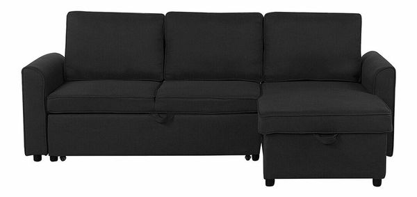 Vytvořte si dokonale útulný prostor v obývacím pokoji, kde budete trávit příjemné večery. Pohovka má praktický úložný prostor na ložní prádlo a lze je rozložit na postel pro dvě osoby. Lehátko je umístěno na levé straně z pohledu sedící osoby. Silně vyztužená sedadla a opěradla jsou čalouněna odolnou polyesterovou látkou v klasické černé barvě a poskytují nejvyšší úroveň pohodlí. Design pohovky na kovových nohách doplní širokou škálu stylů interiérového zařízení.