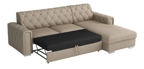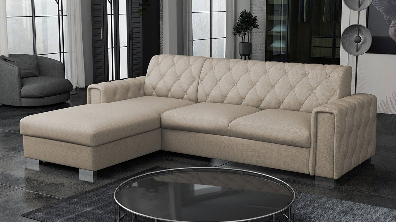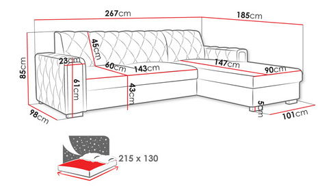 Rohová sedací souprava je ideální volbou pro ty, kteří hledají pohodlí a styl Velká rohová pohovka s funkcí spani a je senzačním způsobem, jak si zařídit elegantní obývací pokoj! upoutá pozornost každého. Výborně se uplatní jako ústřední prvek místnosti. Kromě svého vzhledu nabízí řadu praktických řešení. úložného prostoru uložíte ložní prádlo, přikrývky, polštáře a další předměty. Strávte příjemné společné chvíle s rodinou na tomto krásném rohovém gauči Nyzint. 85 cm, plocha na spaní: 215 x 130 cm, rozměry úložného prostoru: délka: 175 cm, šířka: 68 cm, výška: 21 cm Rohová strana: levá nebo pravá Provedení: konstrukce: 16 mm silná deska + 6 cm silné borovicové dřevo + 16 mm + vlnitá pružina typu B opěradlo: pěna T25/42, rohová pohovka je rozkládací, automatické usnadnění rozkládání, typ DELFIN, funkce spaní, prostor na lůžkoviny, kovové nohy v chromové barvě, čalouněné opěradlo upevněné napevno, rohová pohovka je volně stojící.