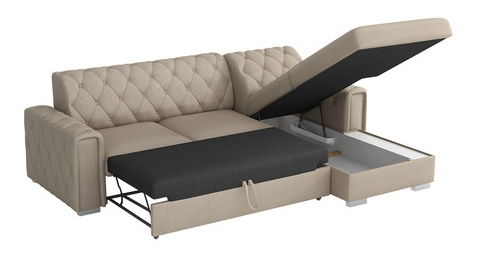 Rohová sedací souprava je ideální volbou pro ty, kteří hledají pohodlí a styl Velká rohová pohovka s funkcí spani a je senzačním způsobem, jak si zařídit elegantní obývací pokoj! upoutá pozornost každého. Výborně se uplatní jako ústřední prvek místnosti. Kromě svého vzhledu nabízí řadu praktických řešení. úložného prostoru uložíte ložní prádlo, přikrývky, polštáře a další předměty. Strávte příjemné společné chvíle s rodinou na tomto krásném rohovém gauči Nyzint. 85 cm, plocha na spaní: 215 x 130 cm, rozměry úložného prostoru: délka: 175 cm, šířka: 68 cm, výška: 21 cm Rohová strana: levá nebo pravá Provedení: konstrukce: 16 mm silná deska + 6 cm silné borovicové dřevo + 16 mm + vlnitá pružina typu B opěradlo: pěna T25/42, rohová pohovka je rozkládací, automatické usnadnění rozkládání, typ DELFIN, funkce spaní, prostor na lůžkoviny, kovové nohy v chromové barvě, čalouněné opěradlo upevněné napevno, rohová pohovka je volně stojící.