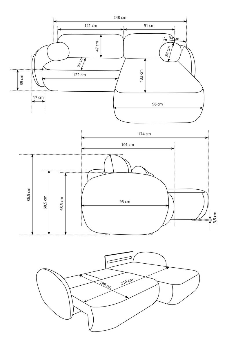 ZobrazitRohová sedačka s konstrukcí ze dřeva, dřevotřísky a překližky nabízí spolehlivost a trvanlivost. Sedák je vyroben z PUR pěny T-3042 a T-2542 s pružinami, což zaručuje komfortní sezení. Sedačka je rozkládací s plochou na spaní 138 x 210 cm. Výška sezení je 39 cm, hloubka sezení 58 cm a výška područky 68,5 cm. Disponuje úložným prostorem a záda jsou potažena stejnou látkou pro jednotný vzhled. Sedačka nemá nastavitelné opěrky hlavy ani područky. Plastové nožičky mají výšku 3,5 cm a typ rozkládání je DL automat. Součástí jsou dva malé polštáře a sedačka je čalouněna kvalitní tkaninou Sicuro.