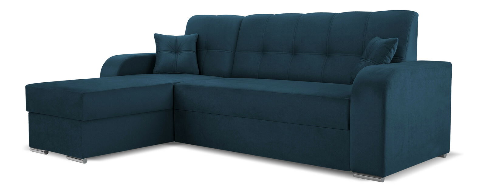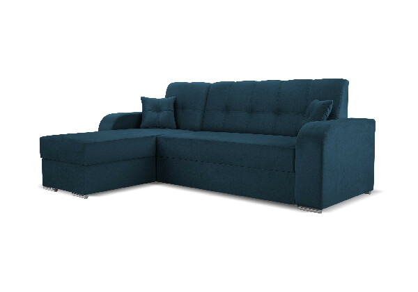 Rohová sedací souprava - Ottawa (tmavě modrá) (L) o výšce 93 cm a šířce 243 cm Monolith 77 a hloubce 161 cm. Tato sedací souprava v klasickém stylu kombinuje estetiku a funkčnost. Její rám je vyroben z masivního dřeva a dřevotřísky, což zajišťuje její pevnost a odolnost. Sedadlo obsahuje bonellovou pružinu o tloušťce drátu 2,4 mm a 3 cm silnou pěnovou výplň T 30, což zaručuje pohodlí při sezení. Opěrky jsou vyrobeny z kombinace pěny, silikonu a doplněny potahovými lištami pro maximální komfort. Tato sedací souprava je vybavena praktickým rozkládacím mechanismem typu "delfín" a obsahuje také úložný prostor. Rozkládací funkce umožňuje vytvořit plochu na spaní o rozměrech 133 x 199 cm. Zadní strana sedačky je potažena stejnou látkou, což zvyšuje její estetický vzhled a umožňuje umístění do středu místnosti. Tvar sedačky je navržen ve tvaru „L“, což poskytuje dostatek prostoru pro relaxaci a pohodlí. Součástí ceny jsou také dva polštáře, které zvyšují její pohodlí a dodávají příjemný a útulný vzhled.