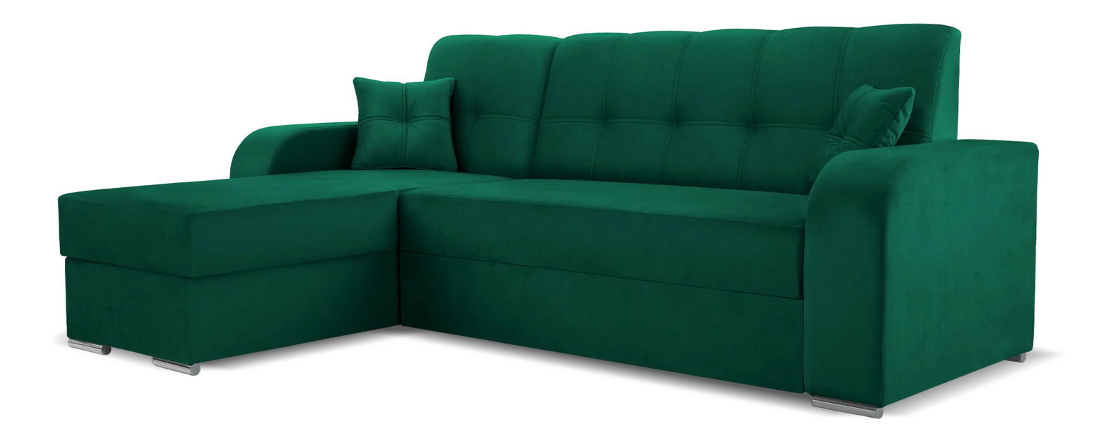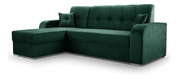 Rohová sedací souprava - Ottawa (tmavě zelená) (L) je kombinací estetiky a funkčnosti. Její rám je vyroben z masivního dřeva a dřevotřísky, což zajišťuje pevnost a odolnost. Sedadlo obsahuje bonellovou pružinu a tlustou pěnu T30 pro maximální komfort při sezení. Opěrky jsou vyrobeny z pěny a silikonu pro ještě větší pohodlí. Sedačka má rozkládací mechanismus typu „delfín“ a praktický úložný prostor. Rozložená vytváří plochu na spaní o rozměrech 133 x 199 cm. Její zadní strana je potažena stejnou látkou, což zvyšuje její estetický vzhled a umožňuje umístění do středu místnosti. Tvar "L" poskytuje dostatek prostoru pro relaxaci a pohodlí. Součástí jsou také dva polštáře, které dodávají sedačce příjemný a útulný vzhled.