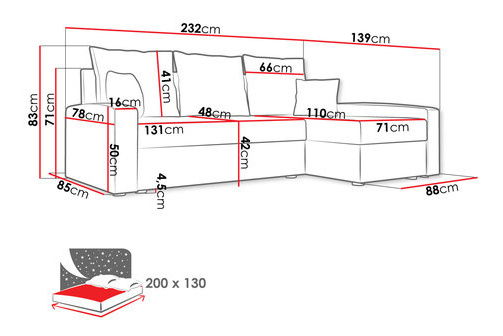Rozkládací pohovka je ideální volbou pro ty, kteří hledají pohodlí a styl. Rozkládací pohovka Papani může stát v obývacím pokoji nebo v ložnici. Díky tomu, že je k dispozici v mnoha různých barevných kombinacích, můžete ji snadno sladit se svým interiérem. Designéři se rozhodli nabídnout odolné látky v nadčasových barvách. Součástí balení jsou malé a velké odpovídající polštáře, které dotváří vzhled nábytku a zvyšují jeho pohodlí. Rohová pohovka s funkcí spaní a úložným prostorem je model, který vám poskytne další plochu na spaní. Může nahradit postel, protože sedačka je uzpůsobena pro každodenní spaní. Pohodlná pěna byla použita i uvnitř opěradla. Dalším komfortem je univerzální strana nábytku, jen při montáži se můžete rozhodnout, zda má být pravostranný nebo levostranný. Volně stojící rohová sedačka ovlivňuje volnost jejího umístění, opěradlo bylo také čalouněno látkou. Rozměry: délka: 230 cm šířka: 146 cm výška: 83 cm Plocha na spaní: 200 x 130 cm Rozměry úložného prostoru: délka: 125 cm šířka: 55 cm, výška: 20 cm Rohová strana: univerzální (stranu si volí zákazník při montáži) Provedení: borové dřevo sedátko: T30 pěna + vlnová pružina opěradlo: T30 pěna roh je vyklápěcí má funkci spánku úložný prostor nohy: plastové opěradlo ve formě pohyblivých polštářů sada polštářů - na zip volně stojící roh (zadní strana potažena látkou) Záruka : 24 měsíců