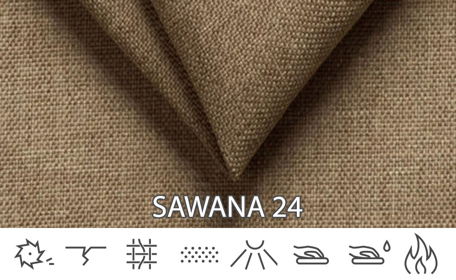 Potahová látka Sawana je jemná, na dotek příjemná pletená látka nenáročná na údržbu/čištění s jemnou a příjemnou texturou pletení. Je vyrobena ze syntetických vláken, která jsou odolná vůči světlu - nevyblednou. Je vyztužena síťkou, která zvyšuje jeho pevnost při roztržení. Nevystavujte látku vysokým teplotám – nežehlete, neperte na mokro a nepoužívejte prostředky k bělení. Péče a čištění pouze se speciálními prostředky pro čalouněný nábytek.
