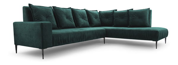 Rohová sedací souprava Romain (tmavě zelená) je luxusní a pohodlná sedací souprava ve stylu glamour. Je vyrobena z kombinace masivního dřeva a dřevotřísky, což zaručuje stabilitu a odolnost. Sedačka má bonellovou pružinu a 3 cm silnou pěnu T 30, což zajišťuje komfortní a podpůrné sezení. Opěrky jsou vyrobeny z pěny a silikonu a doplněny potahovými lištami pro maximální komfort. Tato sedačka má elegantní a čistý design, není rozkládací a neobsahuje úložný prostor. Výška nožiček je 18 cm, což dodává sedačce lehký a vzdušný vzhled. Zadní strana je potažena stejnou látkou, což umožňuje umístění sedačky i do středu místnosti. Sedačka má tvar „L“, což poskytuje dostatek prostoru pro relaxaci a je ideální pro stylové obývací pokoje. V ceně jsou zahrnuty i sedm polštářů vyrobených z měkké velurové tkaniny, dodávající sedačce luxusní a elegantní vzhled.