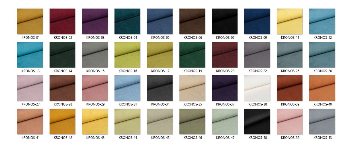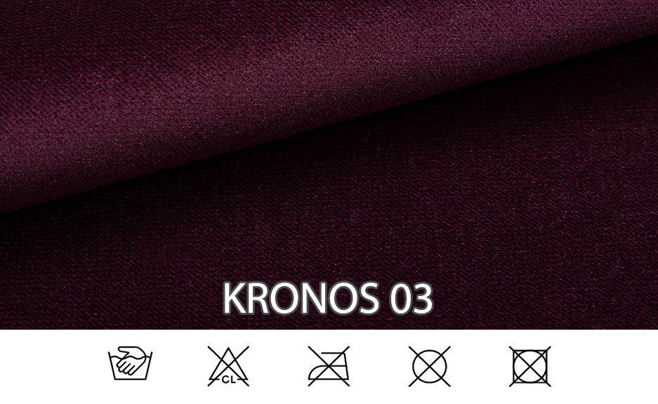 Kronos je plyšová textilie, pěkná a jemná na dotek. Je vytrvalá a je otěru vzdorná během používání. Tato látka se vyznačuje vysokou odolností vůči světlu. Ideálně se hodí pro čalounění křesel, pohovek, sedacích souprav a dekorativních polštářů. Nesmí se prát na mokro, bělit a nesmí se vystavovat vysokým teplotám. Gramáž: 275 g/m². Složení: 100% PES.