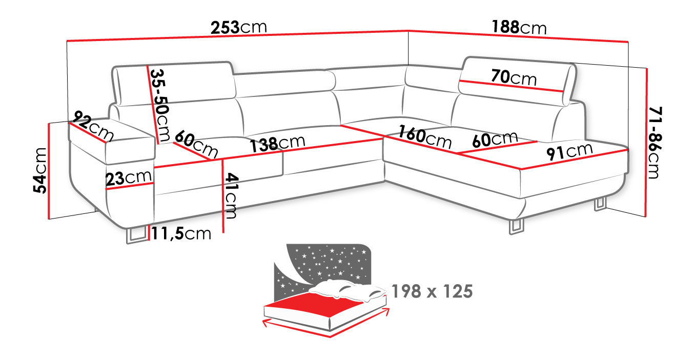 délka: 253 cm, šířka: 188 cm, výška: 71-86 cm, plocha na spaní: 198 x 125 cm