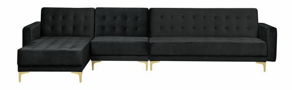 Tato velká rohová pohovka je ideálním kusem nábytku do vašeho obývacího pokoje. Sestává z třímístné a jednomístné pohovky a lehátka. Díky nastavitelnému opěradlu ji lze snadno rozložit na pohodlnou postel pro dvě osoby. Lehátko může být umístěno na pravé nebo levé straně. Tato pohovka je celá čalouněná vysoce kvalitní a stylovou černou sametovou látkou s elegantním prošíváním a nabízí funkčnost i nadčasový styl. Je dobrou volbou do moderních, ale také tradičně zařízených interiérů. Stabilitu pohovky zaručují kovové nohy.