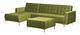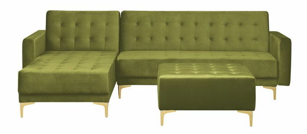 Tato velká rohová pohovka s taburetem je ideálním kusem nábytku do vašeho obývacího pokoje. Díky nastavitelnému opěradlu ji lze snadno rozložit na pohodlnou postel pro dvě osoby. Lehátko může být umístěno na pravé nebo levé straně. Tato pohovka je celá čalouněná vysoce kvalitní a stylovou zelenou sametovou látkou s elegantním prošíváním a nabízí funkčnost i nadčasový styl. Je dobrou volbou do moderních, ale také tradičně zařízených interiérů. Stabilitu pohovky zaručují kovové nohy.