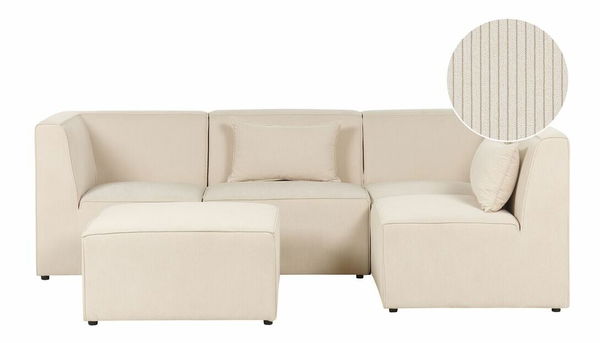 Vytvořte si stylový obývací pokoj s touto moderní pohovkou. Manšestrové čalounění je měkké na dotek a vyznačuje se nápadnou vroubkovanou texturou, díky které vypadá elegantně. Stabilitu pohovky zaručují nohy vyrobené ze syntetického materiálu. Rohová pohovka se skládá ze 4 modulů, které lze spojit do jednoho celku nebo použít samostatně a vytvořit jiné uspořádání. Součástí pohovky je i víceúčelová taburetka, která může posloužit jako místo k sezení, podnožka nebo stolek. Dodatečné polštáře mají snímatelné potahy pro snazší čištění.