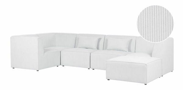 Vytvořte si stylový obývací pokoj s touto moderní pohovkou. Manšestrové čalounění je měkké na dotek a vyznačuje se nápadnou vroubkovanou texturou, díky které vypadá elegantně. Stabilitu pohovky zaručují nohy vyrobené ze syntetického materiálu. Rohová pohovka se skládá z 5 modulů, které lze spojit do jednoho celku nebo použít samostatně a vytvořit jiné uspořádání. Součástí pohovky je i víceúčelová taburetka, která může posloužit jako místo k sezení, podnožka nebo stolek. Dodatečné polštáře mají snímatelné potahy pro snazší čištění.