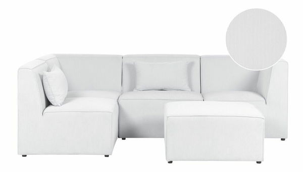 Vytvořte si stylový obývací pokoj s touto moderní pohovkou. Manšestrové čalounění je měkké na dotek a vyznačuje se nápadnou vroubkovanou texturou, díky které vypadá elegantně. Stabilitu pohovky zaručují nohy vyrobené ze syntetického materiálu. Rohová pohovka se skládá ze 4 modulů, které lze spojit do jednoho celku nebo použít samostatně a vytvořit jiné uspořádání. Součástí pohovky je i víceúčelová taburetka, která může posloužit jako místo k sezení, podnožka nebo stolek. Dodatečné polštáře mají snímatelné potahy pro snazší čištění.