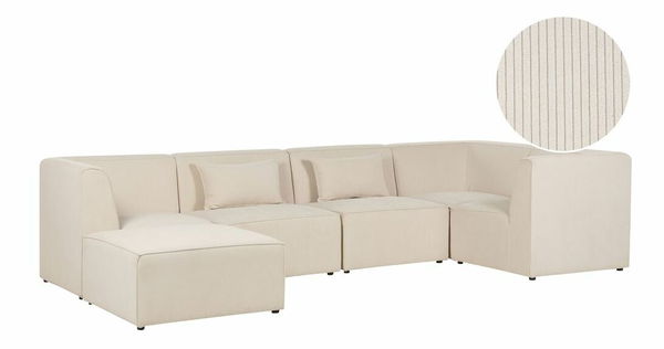 Vytvořte si stylový obývací pokoj s touto moderní pohovkou. Manšestrové čalounění je měkké na dotek a vyznačuje se nápadnou vroubkovanou texturou, díky které vypadá elegantně. Stabilitu pohovky zaručují nohy vyrobené ze syntetického materiálu. Rohová pohovka se skládá z 5 modulů, které lze spojit do jednoho celku nebo použít samostatně a vytvořit jiné uspořádání. Součástí pohovky je i víceúčelová taburetka, která může posloužit jako místo k sezení, podnožka nebo stolek. Dodatečné polštáře mají snímatelné potahy pro snazší čištění.